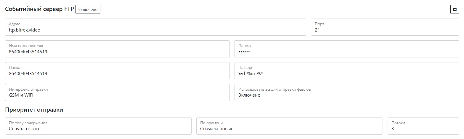 | Адрес | ссылки на FTP сервер для сохранения фото и видео. Может быть как URL сайта, так и IP-адресом |
