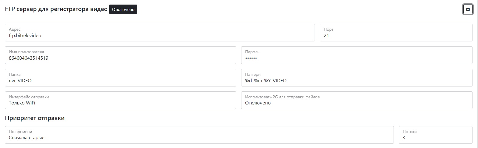 | Папка | Корневая папка, в которую будут отправлены файлы из DVR. При нажатии на кнопку Set folder value=DVR IMEI именем папки будет установлено IMEI устройства. Если на сервере нет папки с таким названием – попытка создания папки при первом подключении |