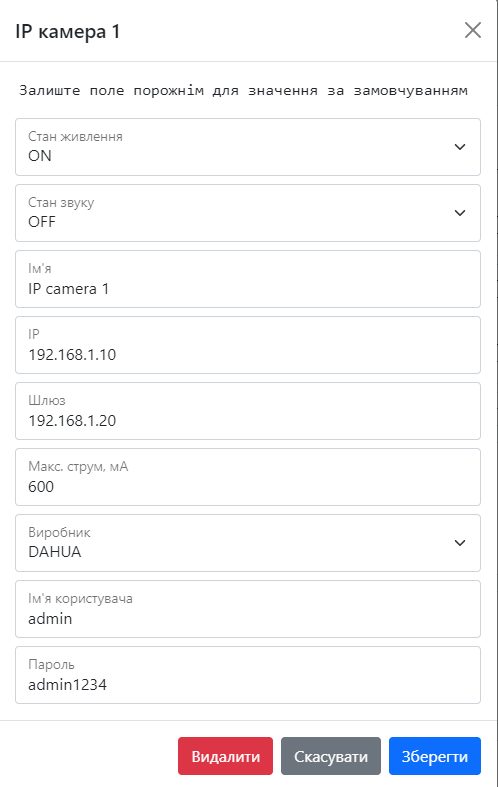 Тут ви можете переглянути ваші параметри, змінити їх внісши нові дані або ж видалити камеру