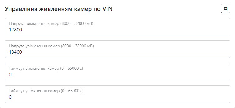 | Таймаут увімкнення камер (0-65000 с) | Час увімкнення камери, відлік якого починається із появою напруги |