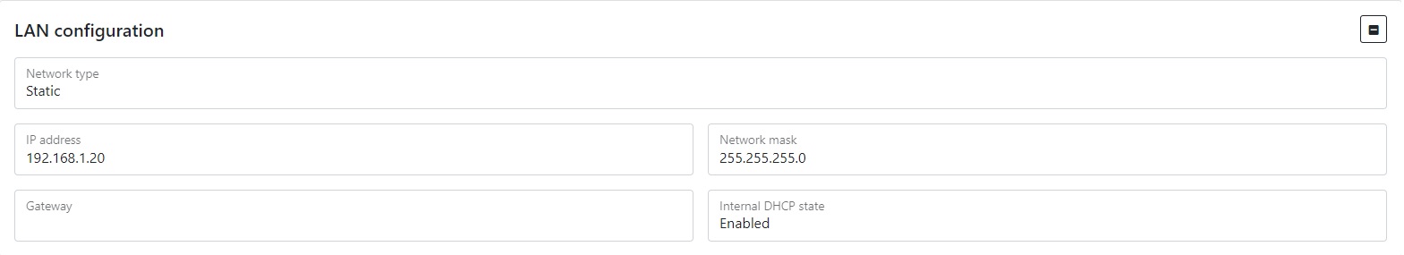 | IP address | IP address. To use the LAN as the Internet connection interface, the IP address must be different from 192.168.1.20 and the Gateway must be installed. |