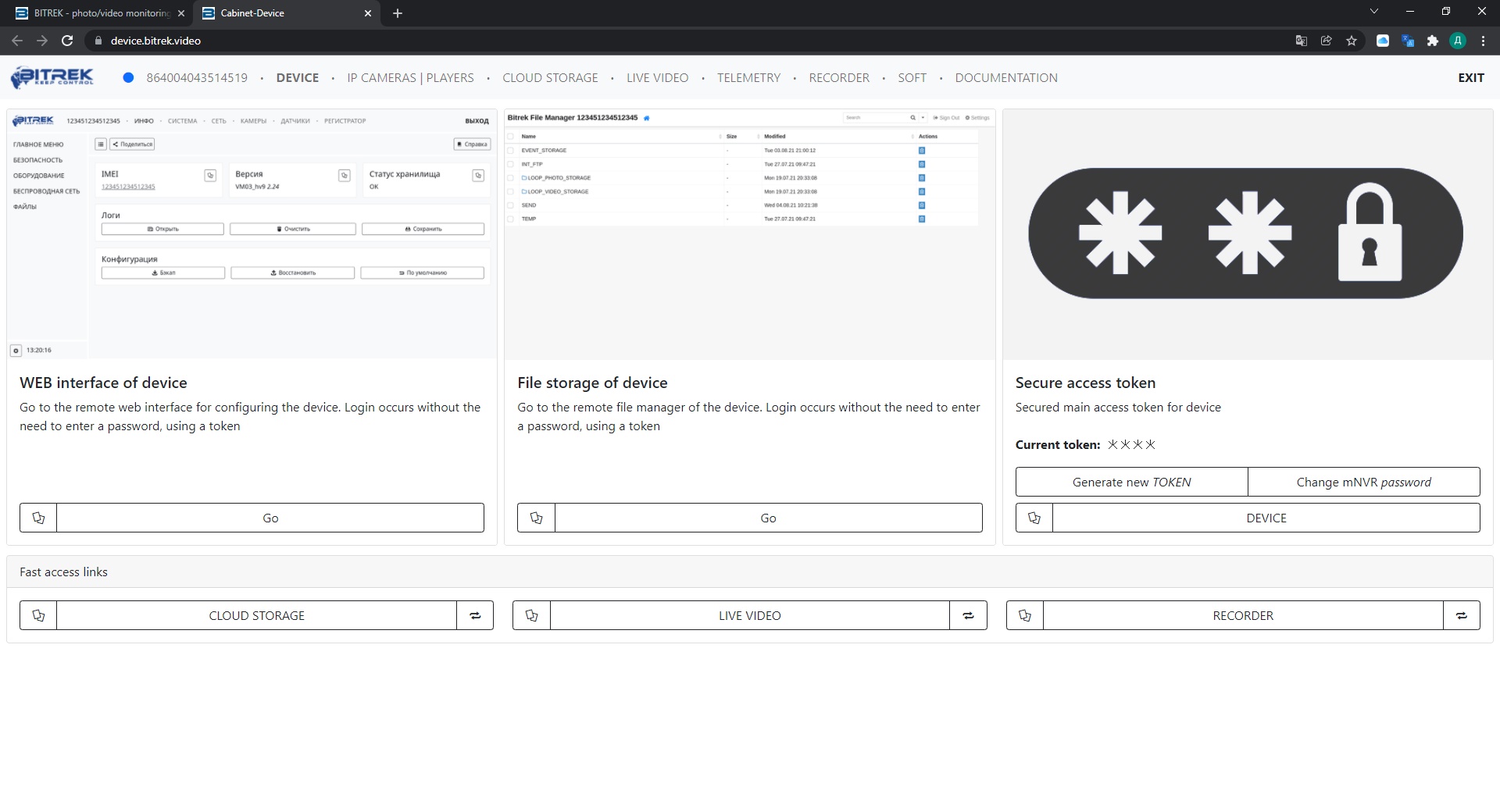 In the main menu in the Secure Access Token section press the Streaming video button and go to the corresponding section, where all the cameras connected to the device and their live broadcast will be displayed