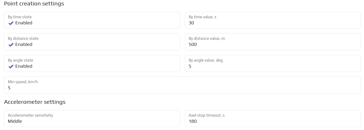 Stop timeout - the time at which the vehicle can stand and the track of points is not reset (for example, when the vehicle is at a traffic light)