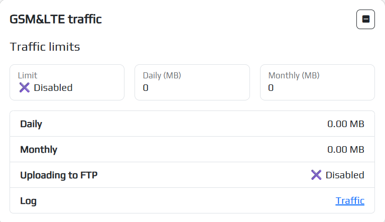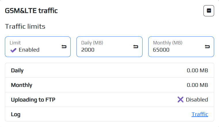 You can configure the traffic limit on the device to save it, for this you need to go to the NETWORK/GSM tab, enable the limit using the corresponding button and set a limit for the use of traffic by the device per day or per month.