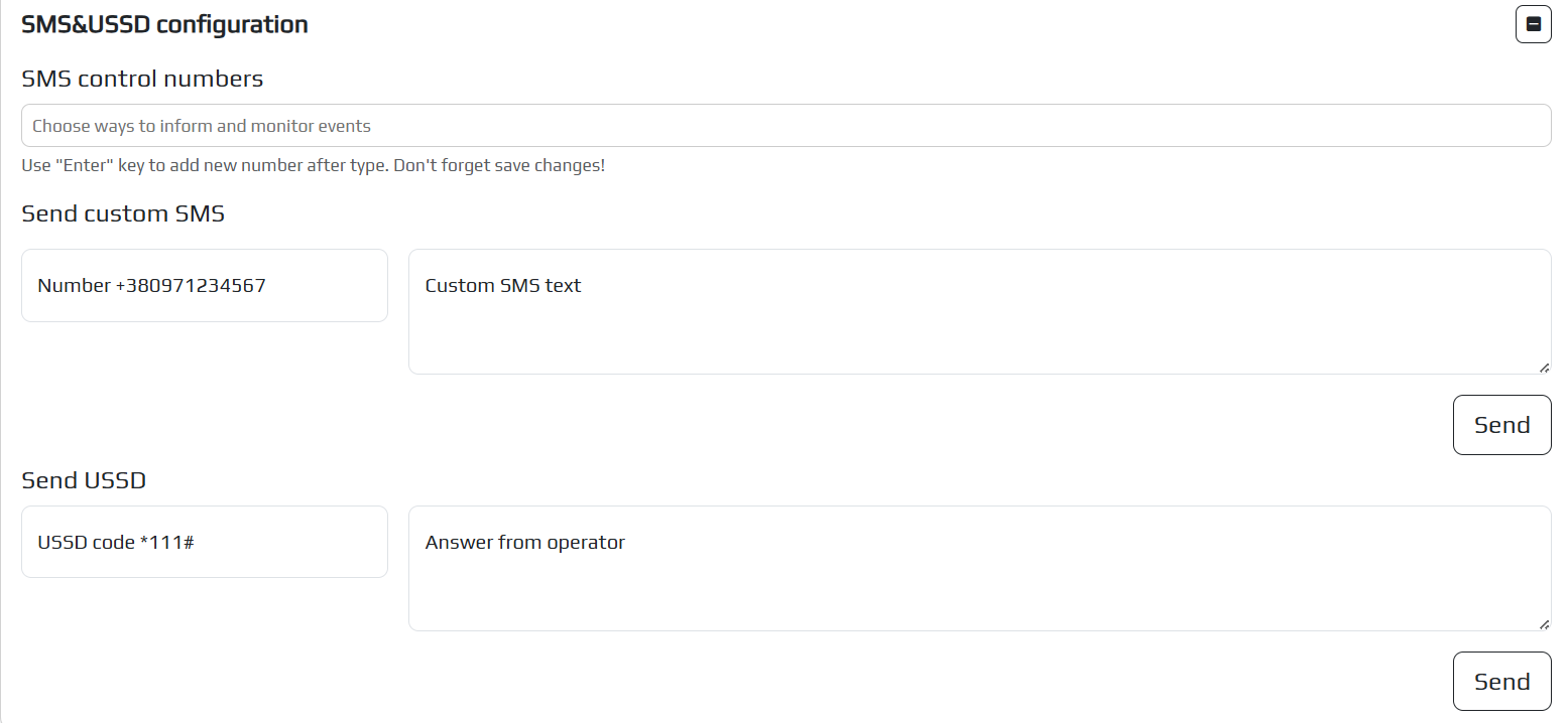 The device allows you to configure sending SMS by the user for example to receive the number from which the SMS is sent. And send USSD codes for example *111# to check the account on the SIM card.