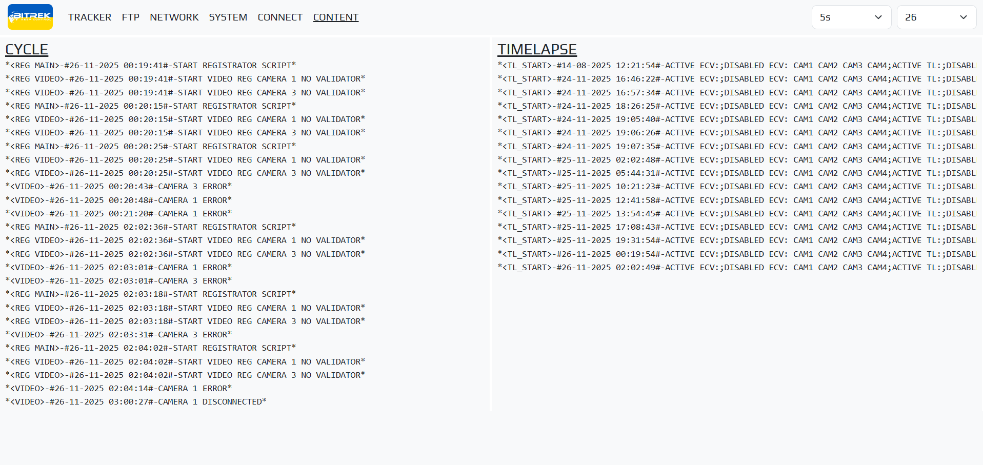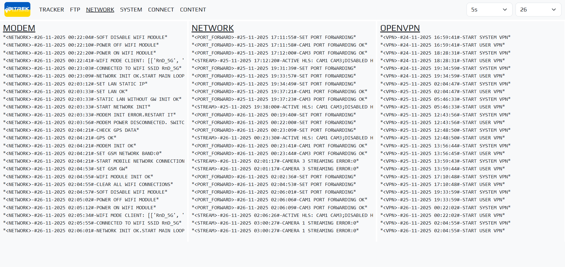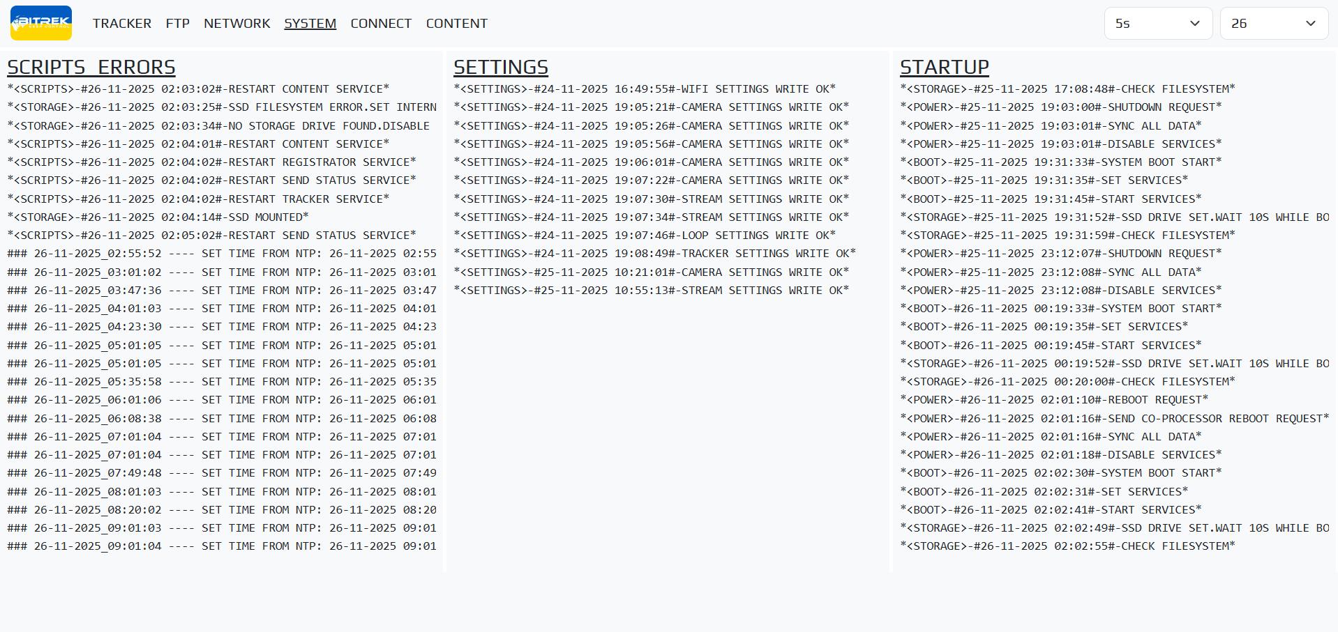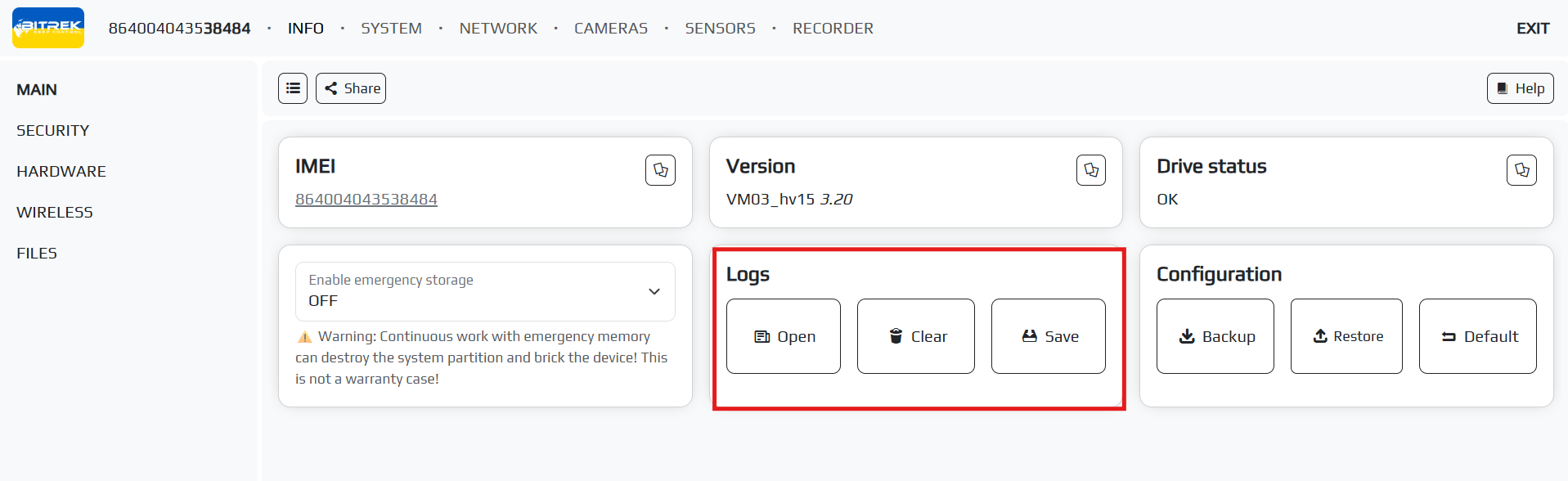 mNVR provides the ability to view logs on the device to diagnose problems. To do this, go to the tab “INFO/LOGS/OPEN”
