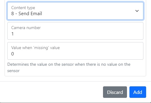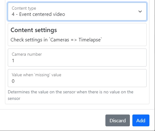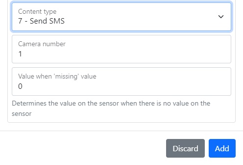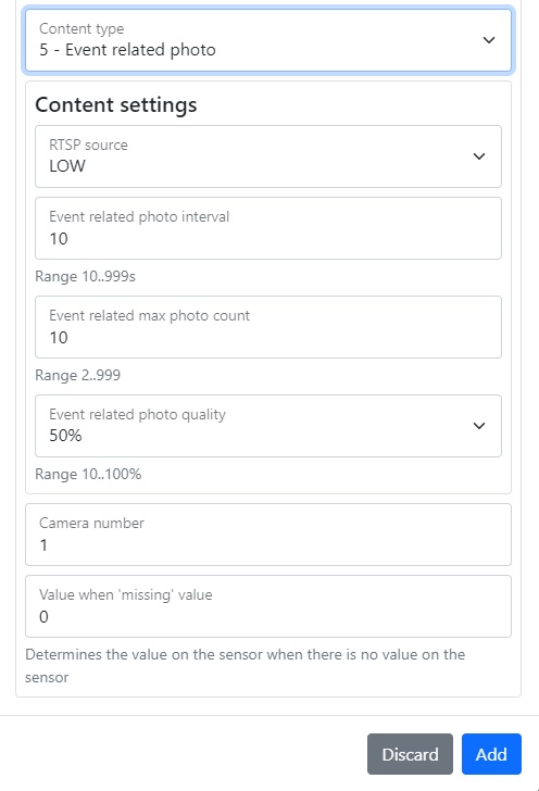 The section contains the selection of the sensor subtype, camera number, photo count and its interval, RTSP source and reference to it, the maximum video time associated with the event, the number of photos and frames per second, video time, the interval between photos associated with the event, its count and quality content type, event type, upper and lower limit, average latency, and resubmission interval