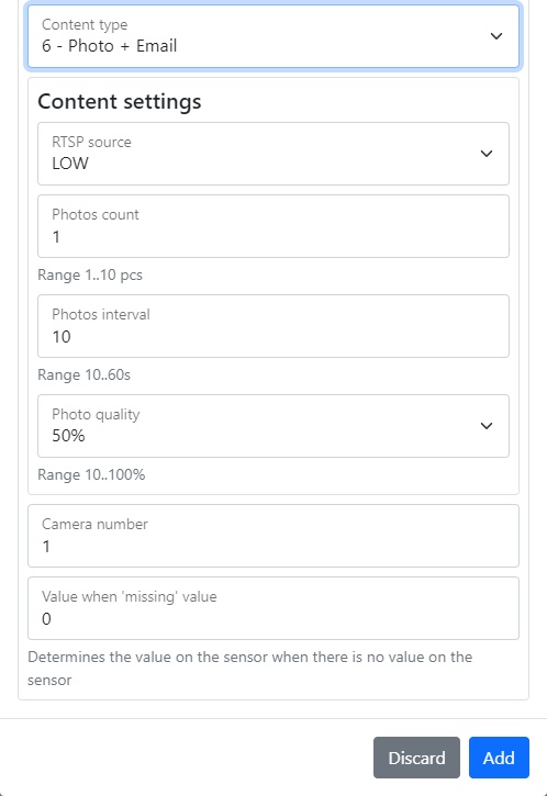 | Фото + Email | Allows you to select the RTSP source, photo count, interval between them and their quality |