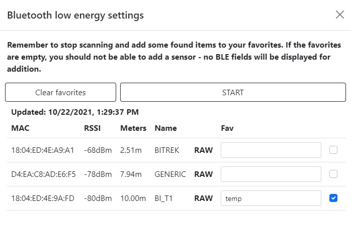 If you have BLE sensor you can connect it to mNVR. First you need to scan it by pressing BLE scan button and then press Start button, after that you can find the desired sensor in the list below, also in this list you can check the information such as: • MAC address • Signal quality level • Distance to the object (in meters) • Information about the signal • Time from the sensor detection After that in sensor menu is need to press BLE settings button and add your sensor to favorite, in this way you can add sensors from favorite in adding sensor menu