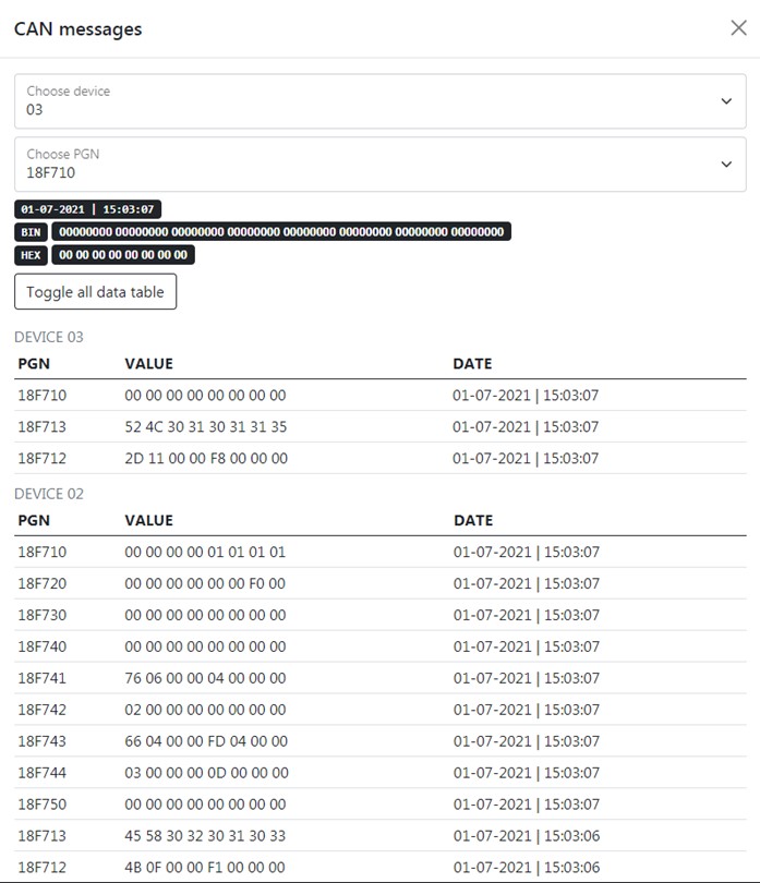 You can check the state of your devices by pressing CAN messages button, there you can choose the device which you want to check by choosing his address on CONNECT ID, and PGN and see the value which devices will be send. Value will be send in HEX system, to convert in DEC system you need to highlight it and lower right corner will be converted value