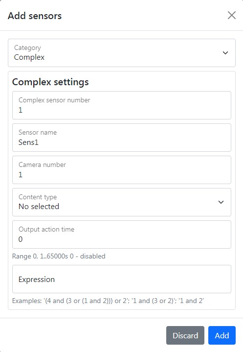 When you create two or more sensor, you can combine it by creating complex sensor. To do that you need choose the sensor type, set output action time and write expression that should show the relationship between the sensor for their correct operation