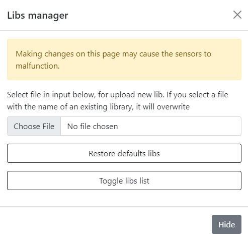 If you have a library, that you created manually, you can download it with the help of libs manager. To do that, you need to press Choose file button and download file of .xml format. To choose one of preseted libraries you need to press Toggle libs list button, to restore default libraries press Restore default libs