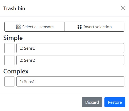 If you accidentally delete some of your sensors or want to restore old you can do it by trash bin menu, you need to select desired sensors and press restore button or discard if you change your mind