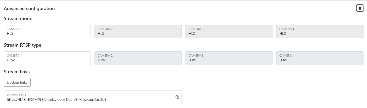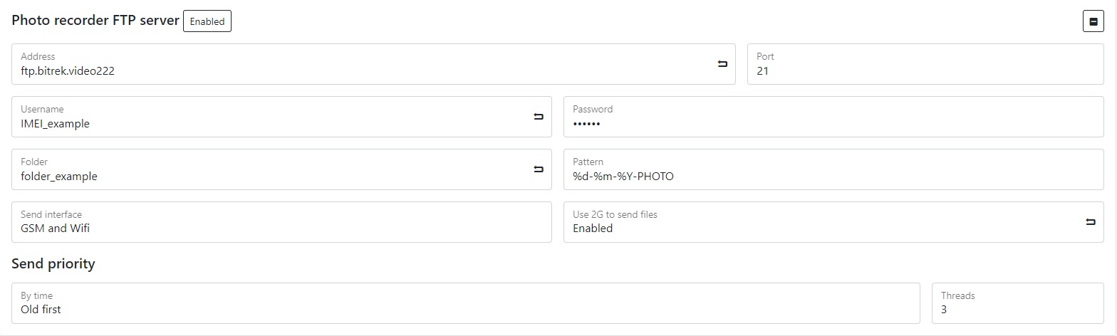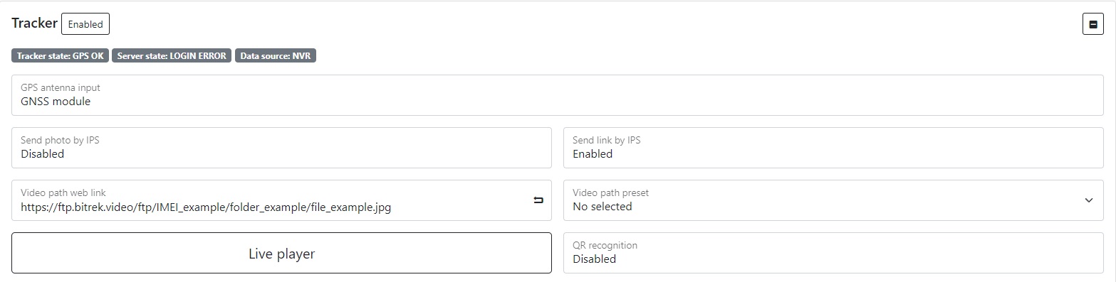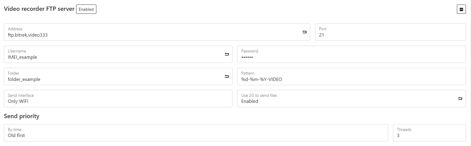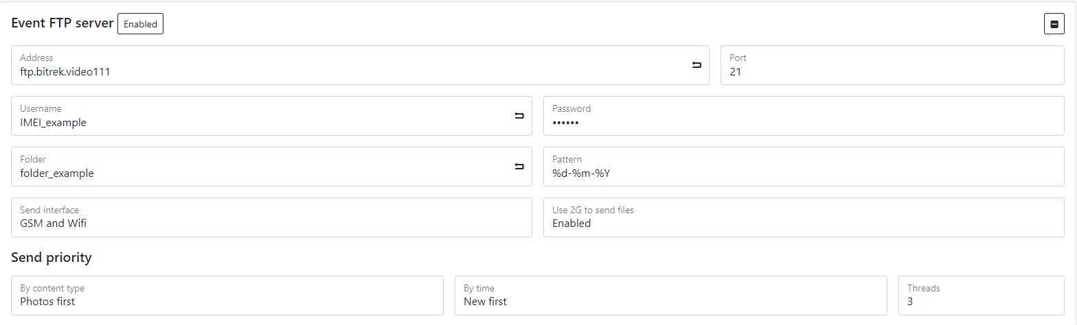 Presetting the link to the video - if you have paid for FTP access, you can select the server to which you can go by specifying the link to the video in the appropriate field (you need to specify the server address, device ID, file package and its name, for example: https://ftp.bitrek.video/ftp/IMEI/IMEI/file_example.jpg
