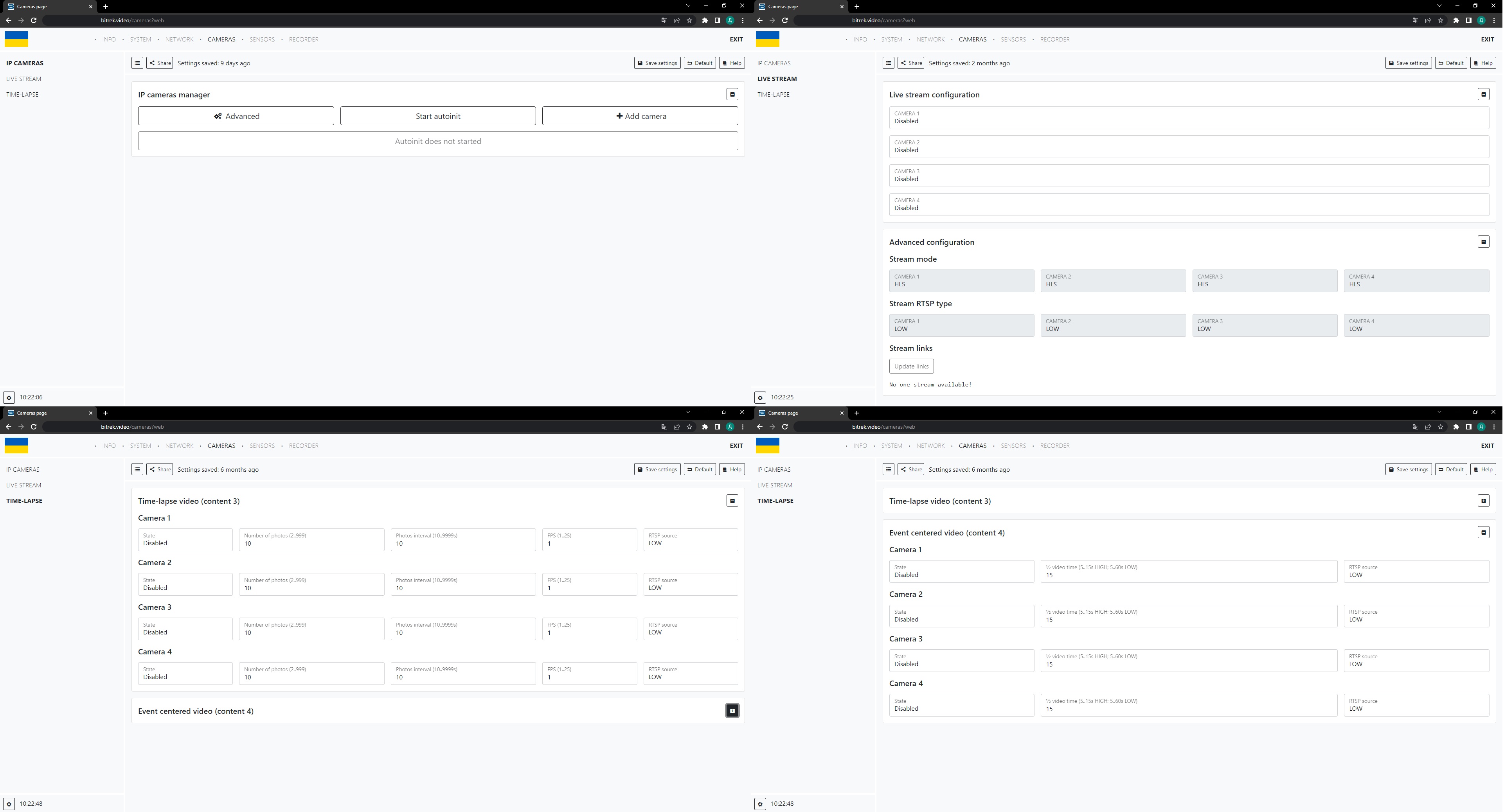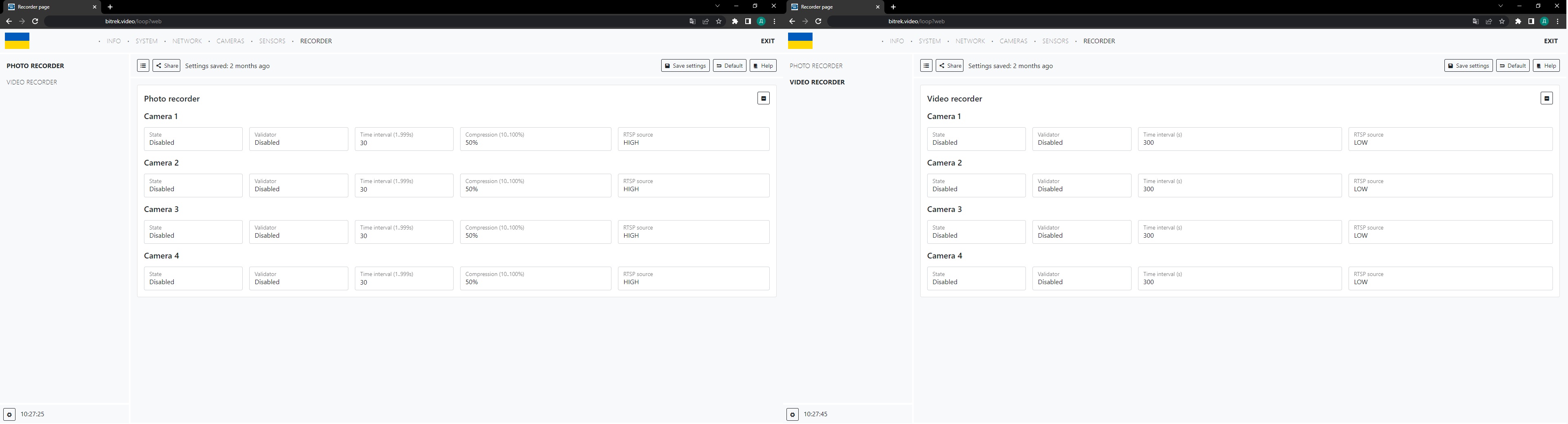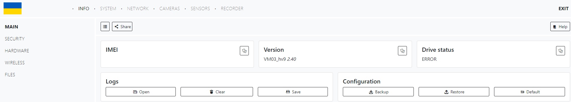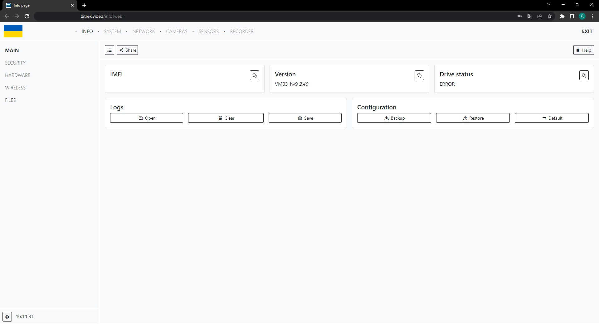 Here we can see the main tabs such as: INFO, SYSTEM, NETWORK, CAMERAS, SENSORS, RECORDER and auxiliary tabs for each of the sections located on the left. Let's go through each of the tabs briefly
