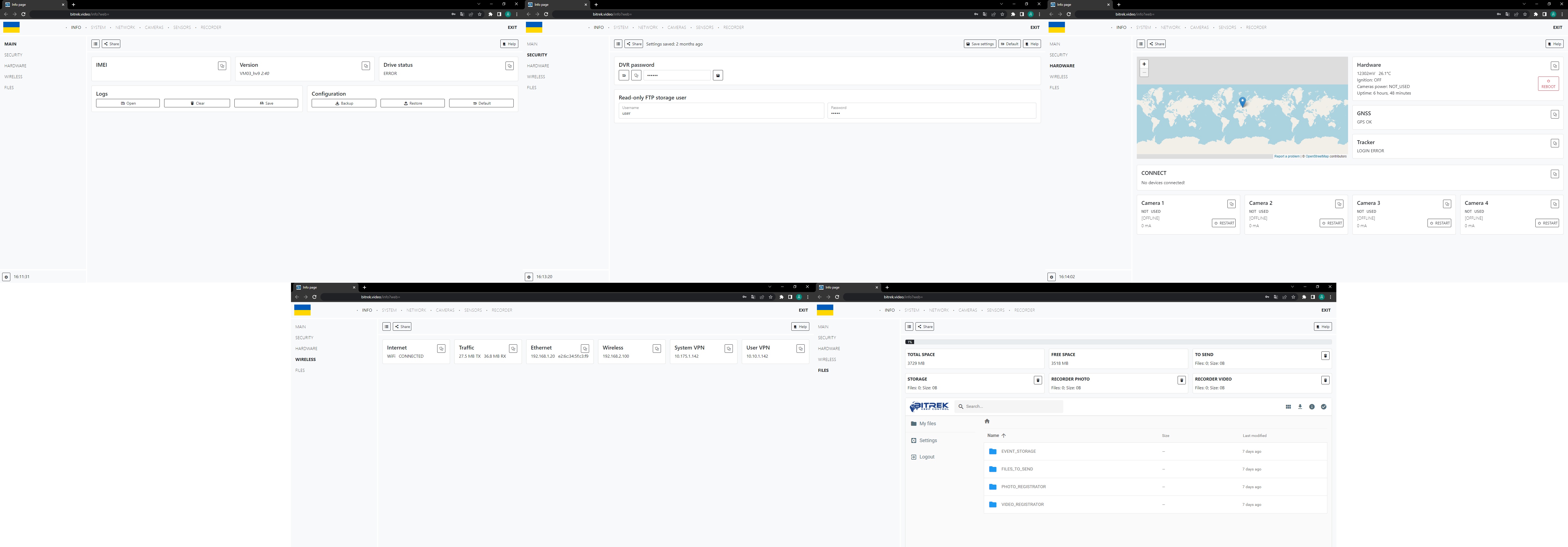 Section SETTINGS checks all functions of your device (WIFI, VPN, VPN, GSM, tracker, cameras, etc.)