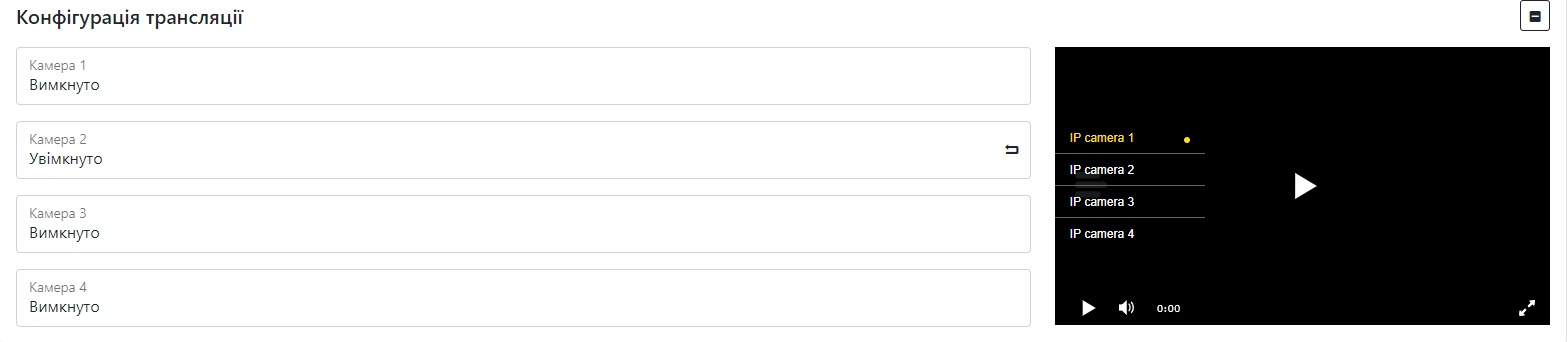 After connecting and configuring the camera, you can also set up a live broadcast. To do this, go to the appropriate tab, in the broadcast configuration section, enable the desired camera, and in the player, click on the menu on the side and select the desired camera to view the broadcast.