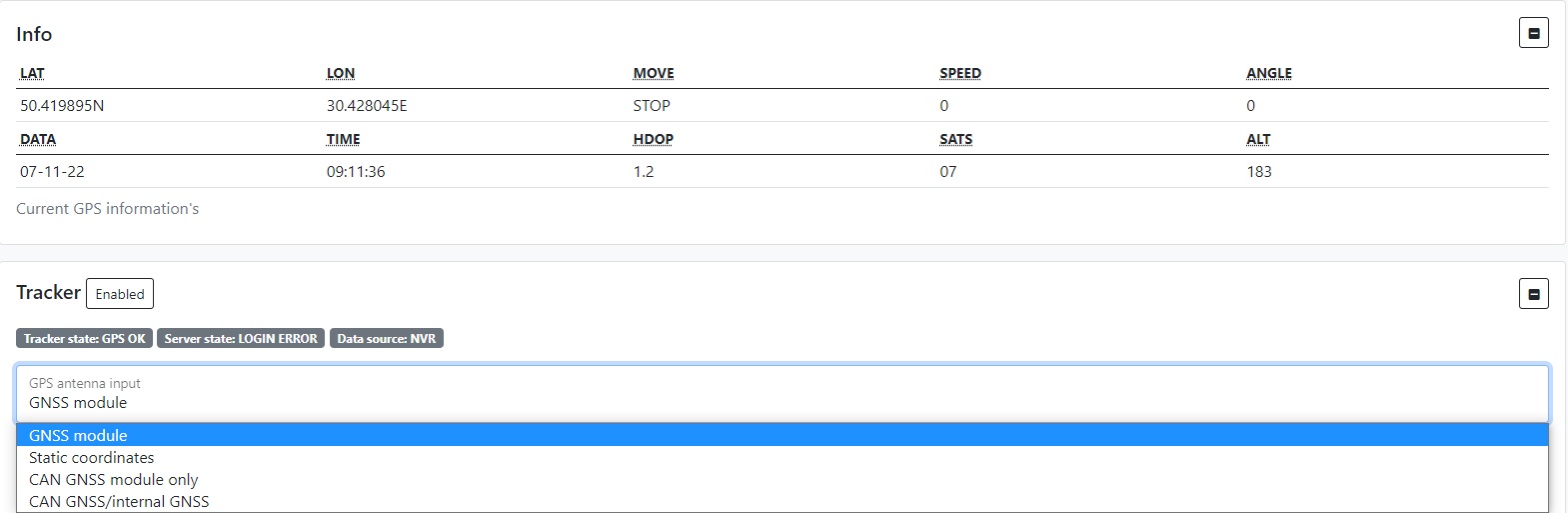 After successful configuration of the module in the Info tab you can see the current GPS information about your location