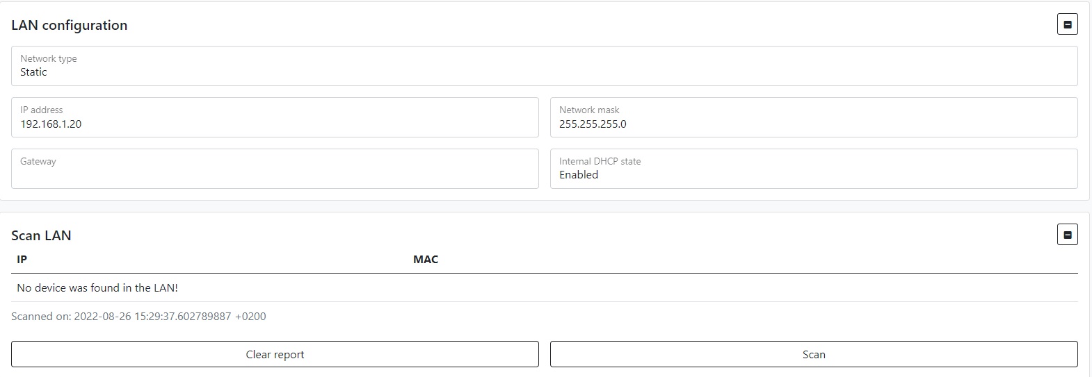 - Or set it manually (static) by entering the IP address of the device, subnet mask, gateway, and internal DCHP state (turn off if you connect a router that has its own DHCP server)