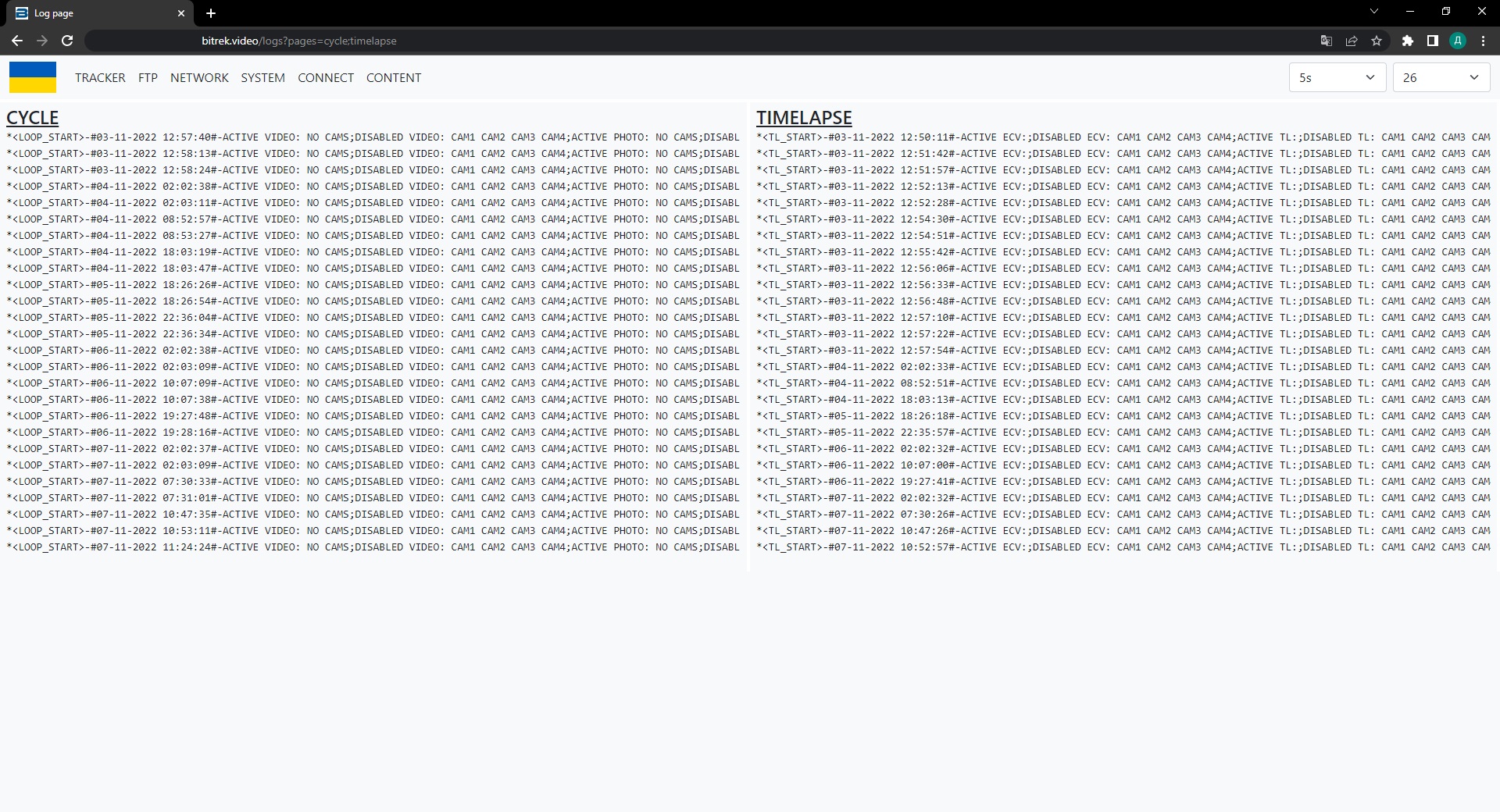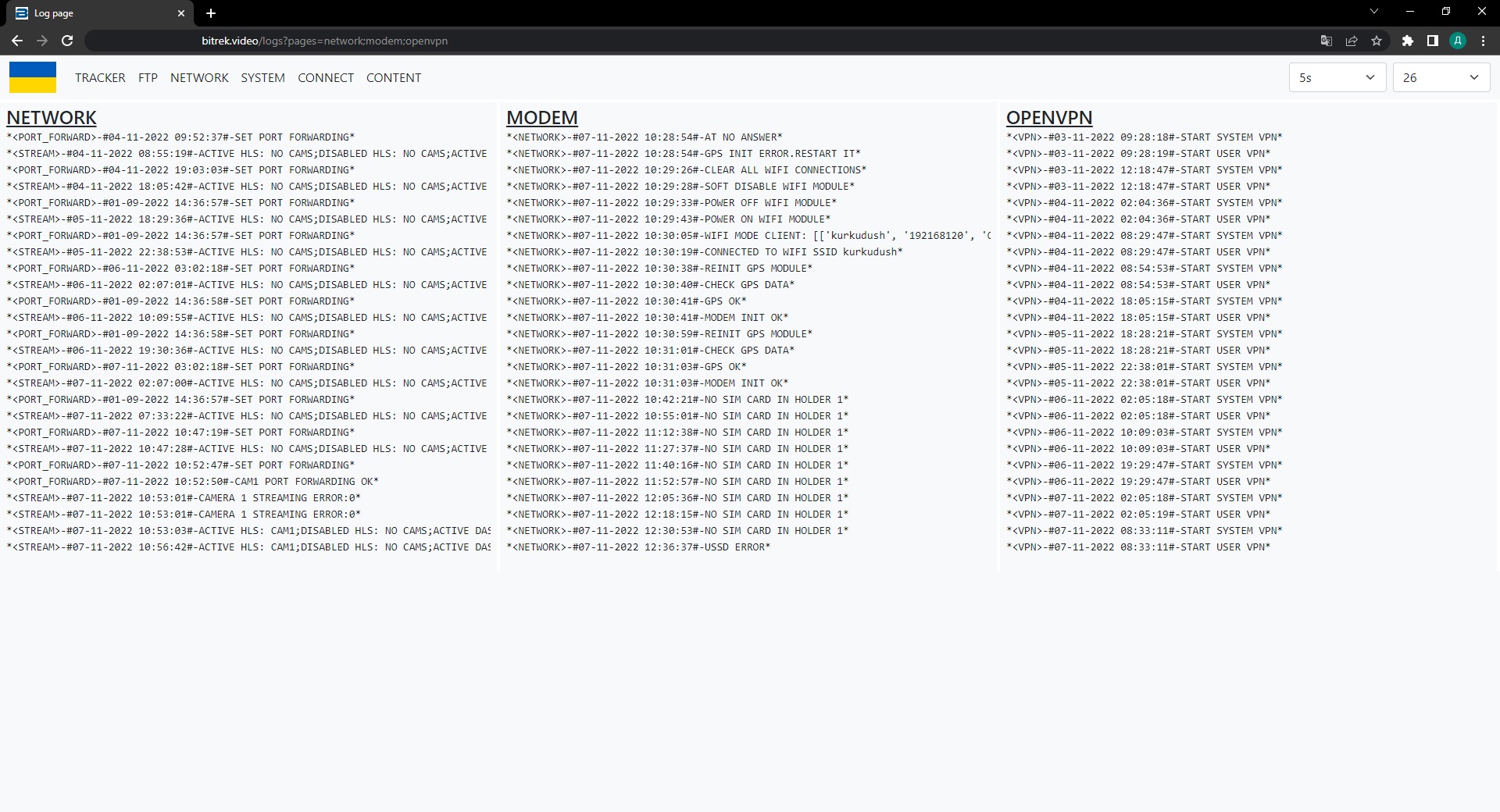 mNVR provides the ability to view logs on the device to diagnose problems. To do this, go to the tab “INFO/LOGS/OPEN”