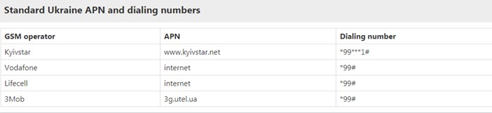 Таблица 3 – APN и номера дозвона для основных операторов Украины