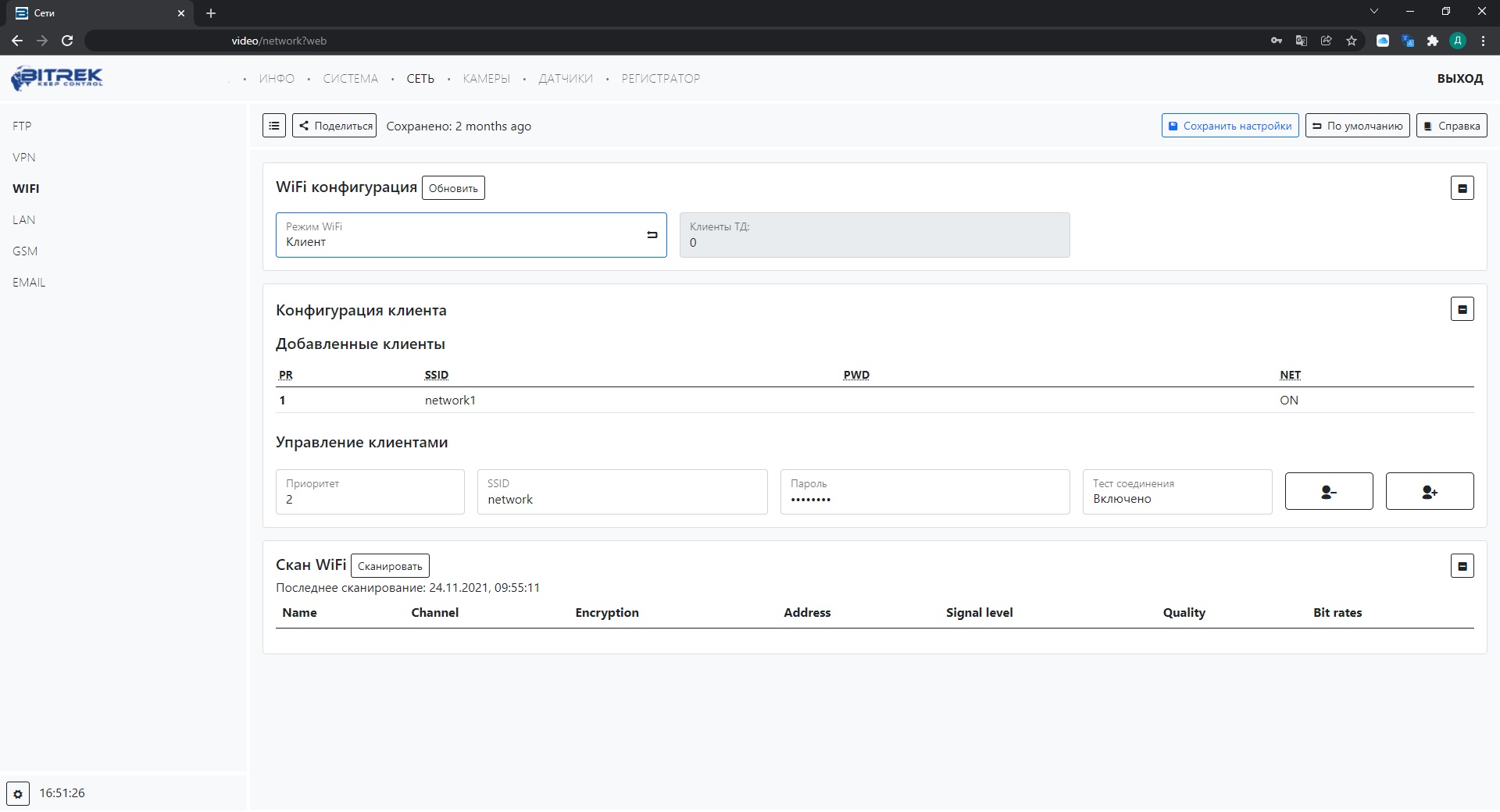 После этого вам нужно нажать кнопку Scan WiFi для просмотра существующих WiFi сетей. Просмотрев SSID, тип безопасности точки доступа и его MAС-адрес, в меню управления клиентами вы можете настроить приоритет подключения к точкам доступа и ввести их SSID и пароль , также при желании вы можете провести тест соединения для определения качества сигнала