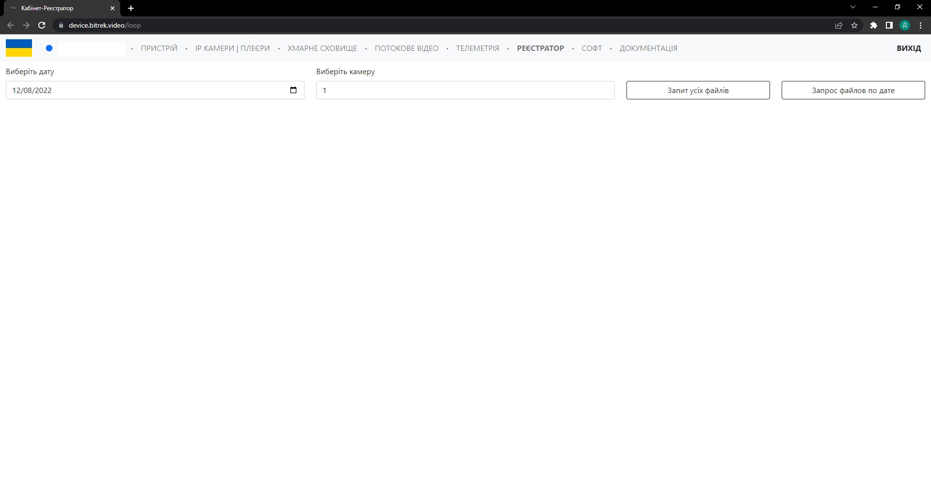 В даному розділі ви маєте змогу знайти файли які були записані на вашому пристрої по даті запису або ж камери, для цього потрібно вибрати потрібну камеру і дату, та натиснути кнопку Запит файлів по даті