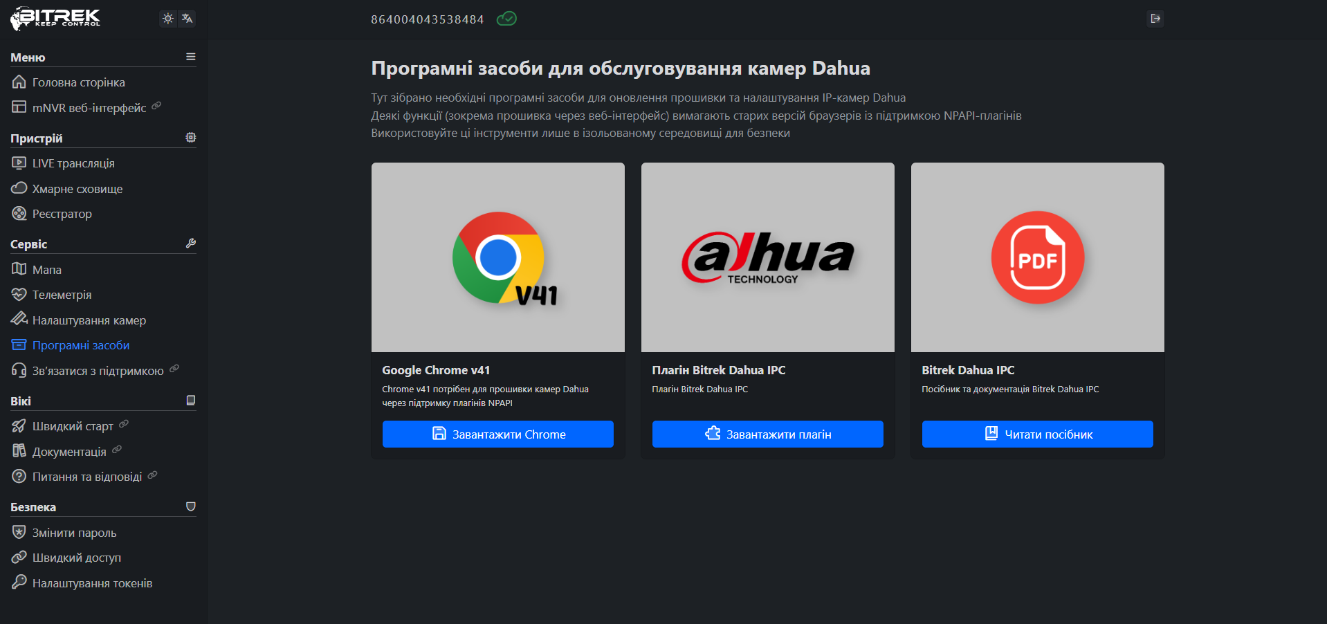 На цій вкладці ви маєте можливість ознайомитися із програмним забезпеченням для кращої роботи пристрою, на даний момент ви можете завантажити Chrome 41 версії, для можливості налаштування камери Bitrek Dahua та ознайомитися із технічною документацією для цієї камери
