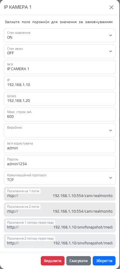 Тут ви можете переглянути ваші параметри, змінити їх внісши нові дані або ж видалити камеру