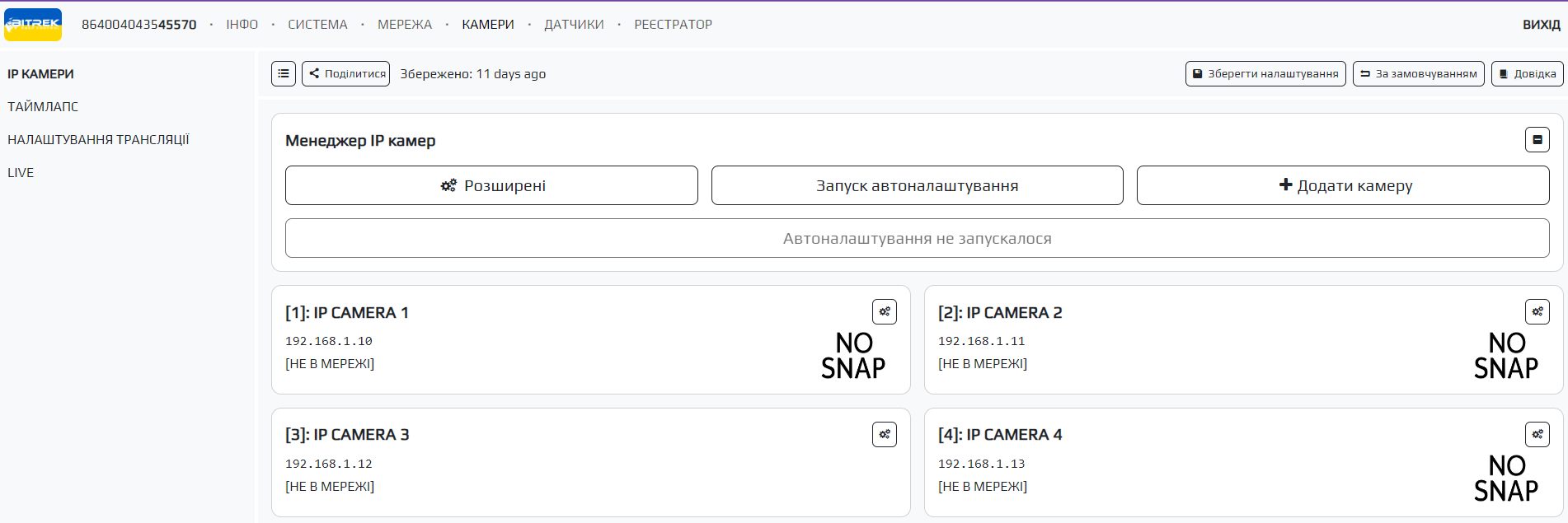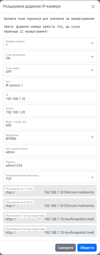 Розділ допомагає додати камери для роботи з пристроєм , натисніть кнопку Додати камеру щоб додати камеру автоматично, або ж налаштуйте вручну натиснувши кнопку Розширені