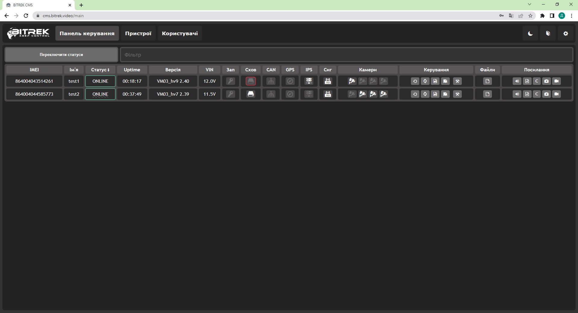 | Статус | Поточний стан підключення пристрою до системи - ONLINE або OFFLINE | Інтервал опитування пристрою до 300с, якщо статус підреслений - інформація не обновлялась давно або можливо, актуальний статус інший |