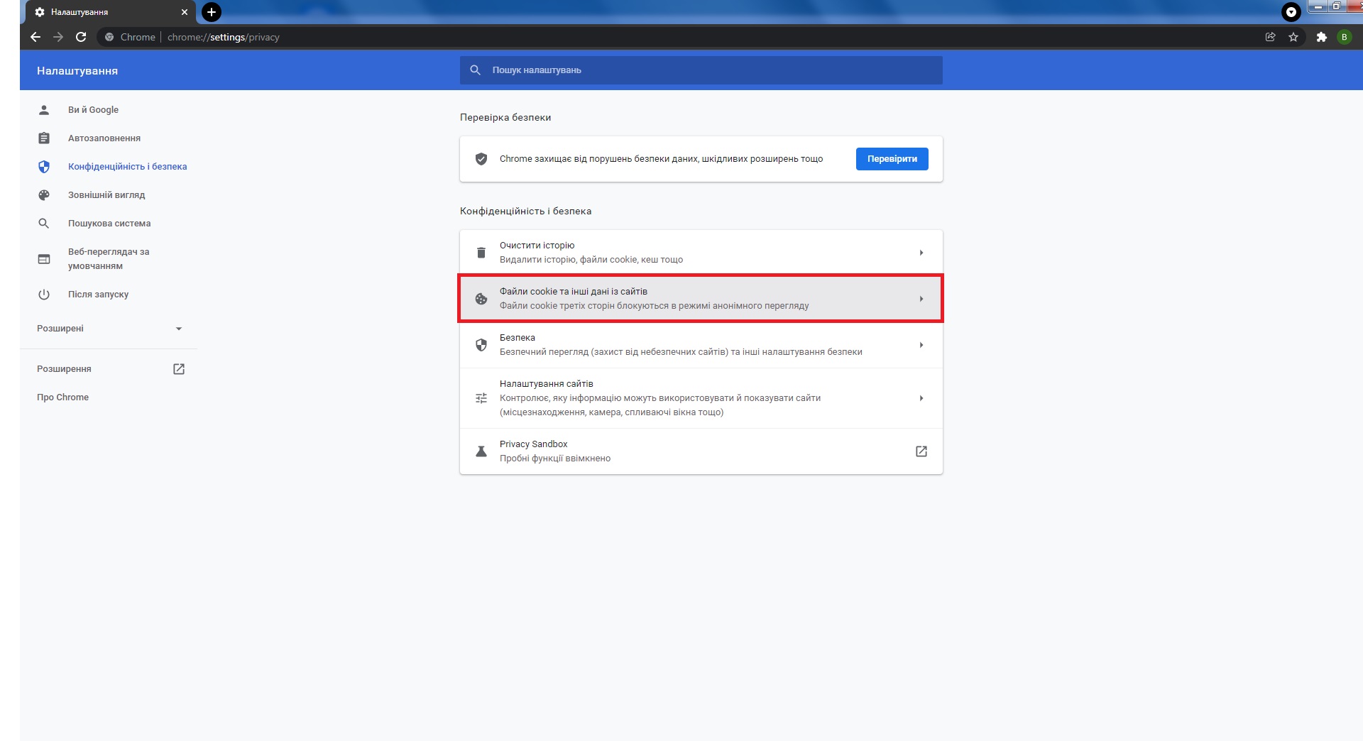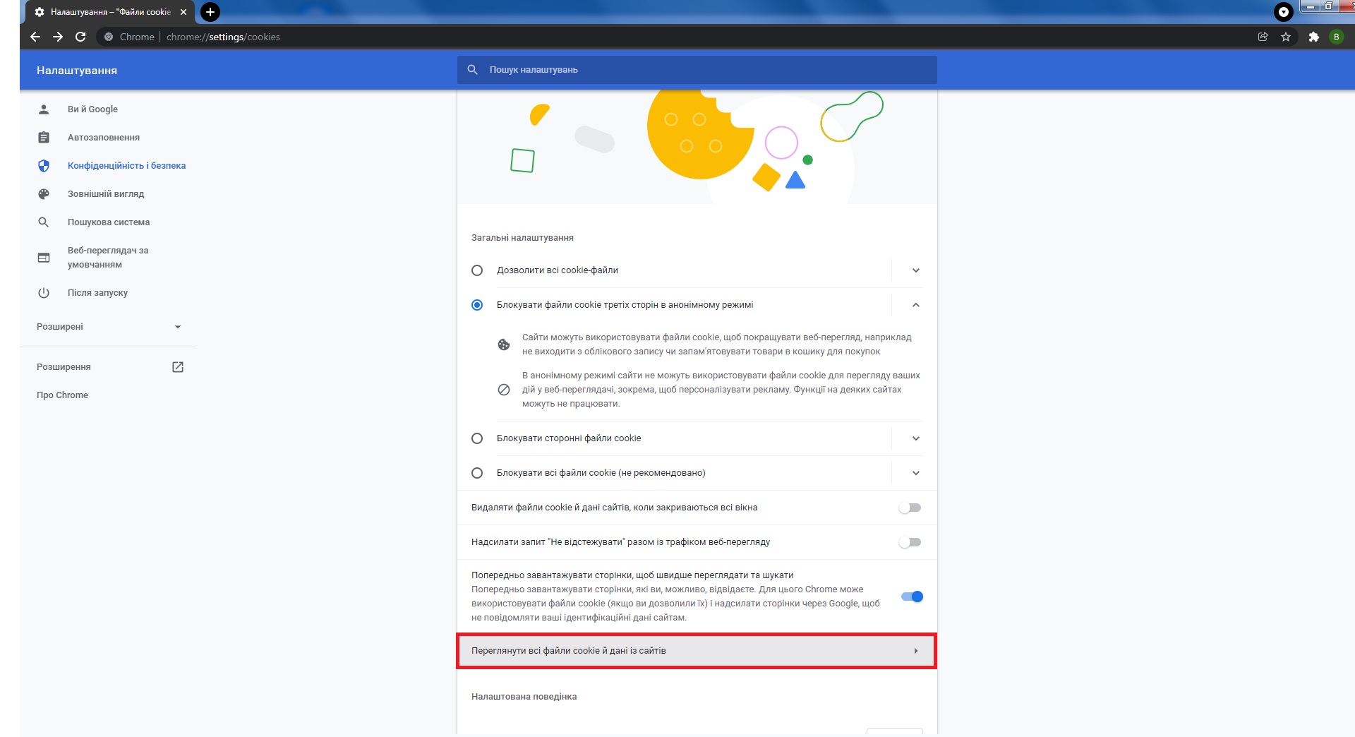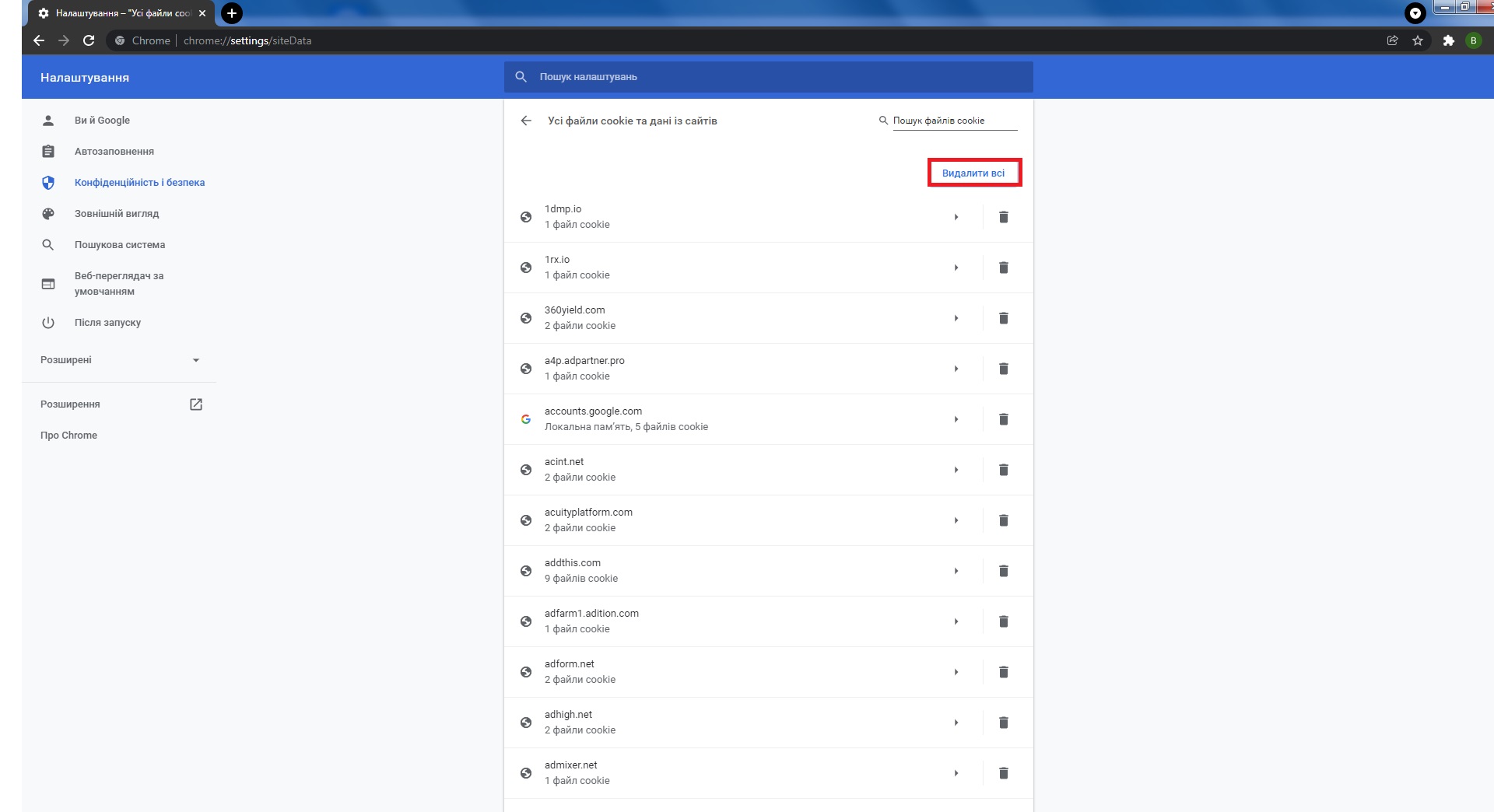 - Перейти на вкладку Файли cookie та інші дані із сайтів