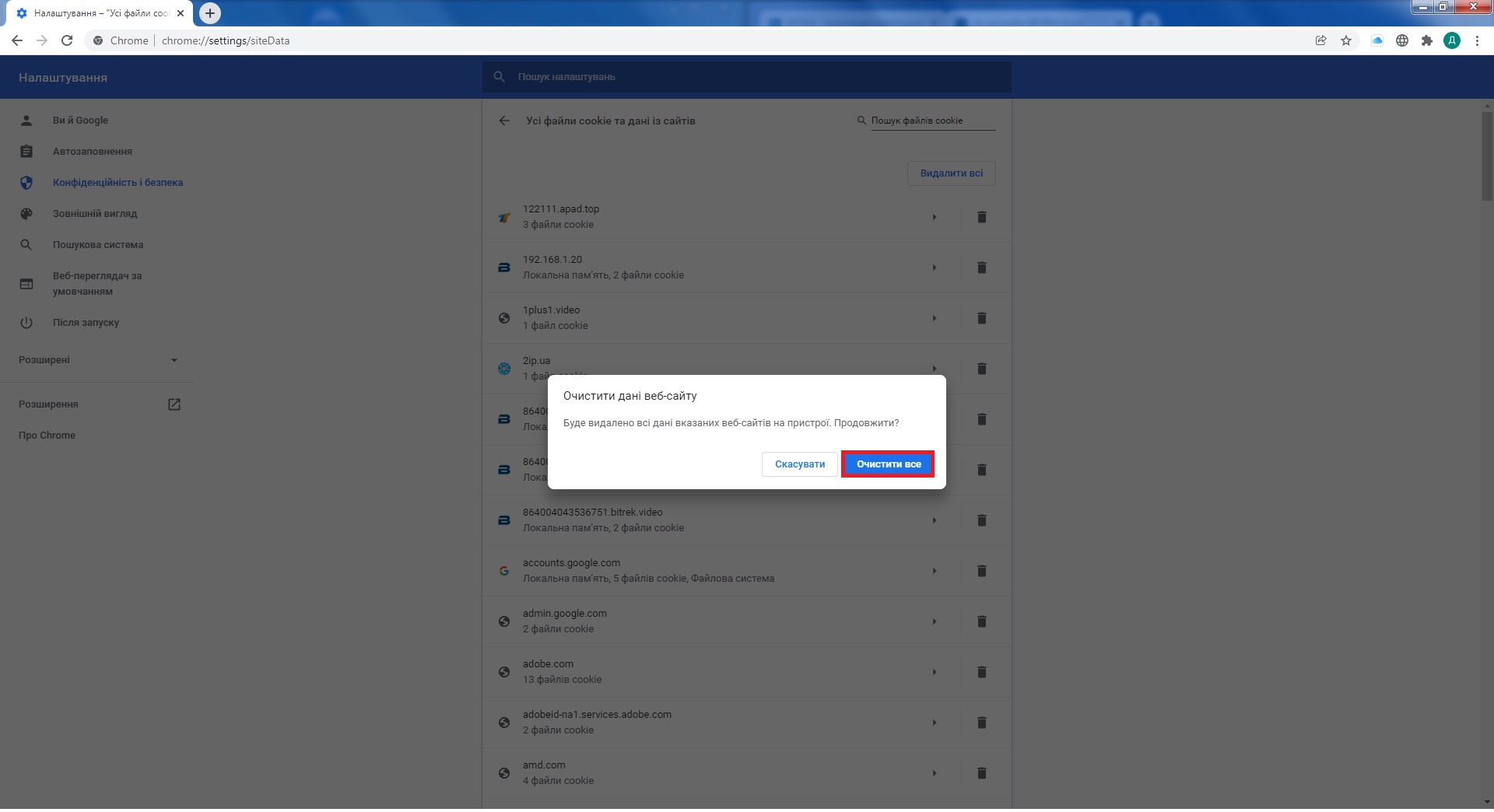 - Підтвердити натиснувши кнопку Очистити все