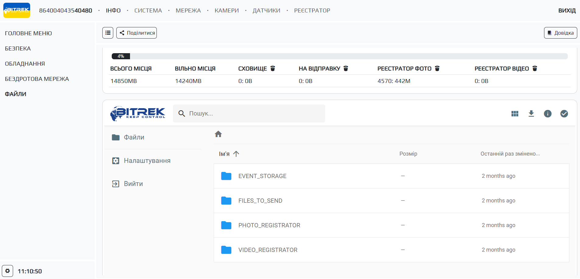 - кількість вільного місця в сховищі пристрою а також кількості файлів в черзі на надсилання