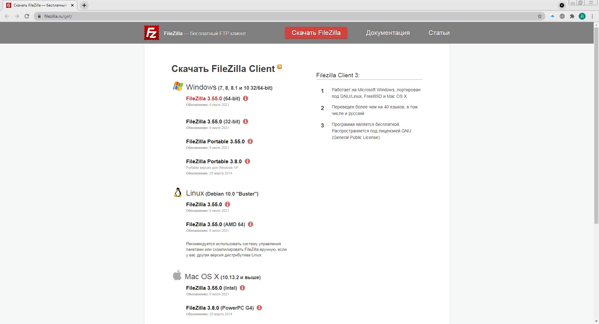 Переходимо за посиланням та опиняємось на сторінці завантаження FileZilla