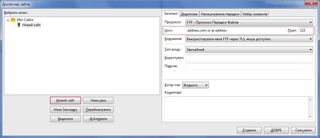 для того щоб не вводити цю інформацію постійно ви можете її зберегти зайшовши у розділ Файл/Диспетчер сайтів або натиснувши сполучення клавіш Ctrl+S , після цього натиснути новий сайт та в полі хост написати адресу без приставки http, https або IP адресу, та його порт, після чого натиснути кнопку ДОБРЕ