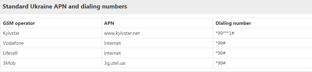 Таблиця 3 – APN і номери дозвону для основних операторів України