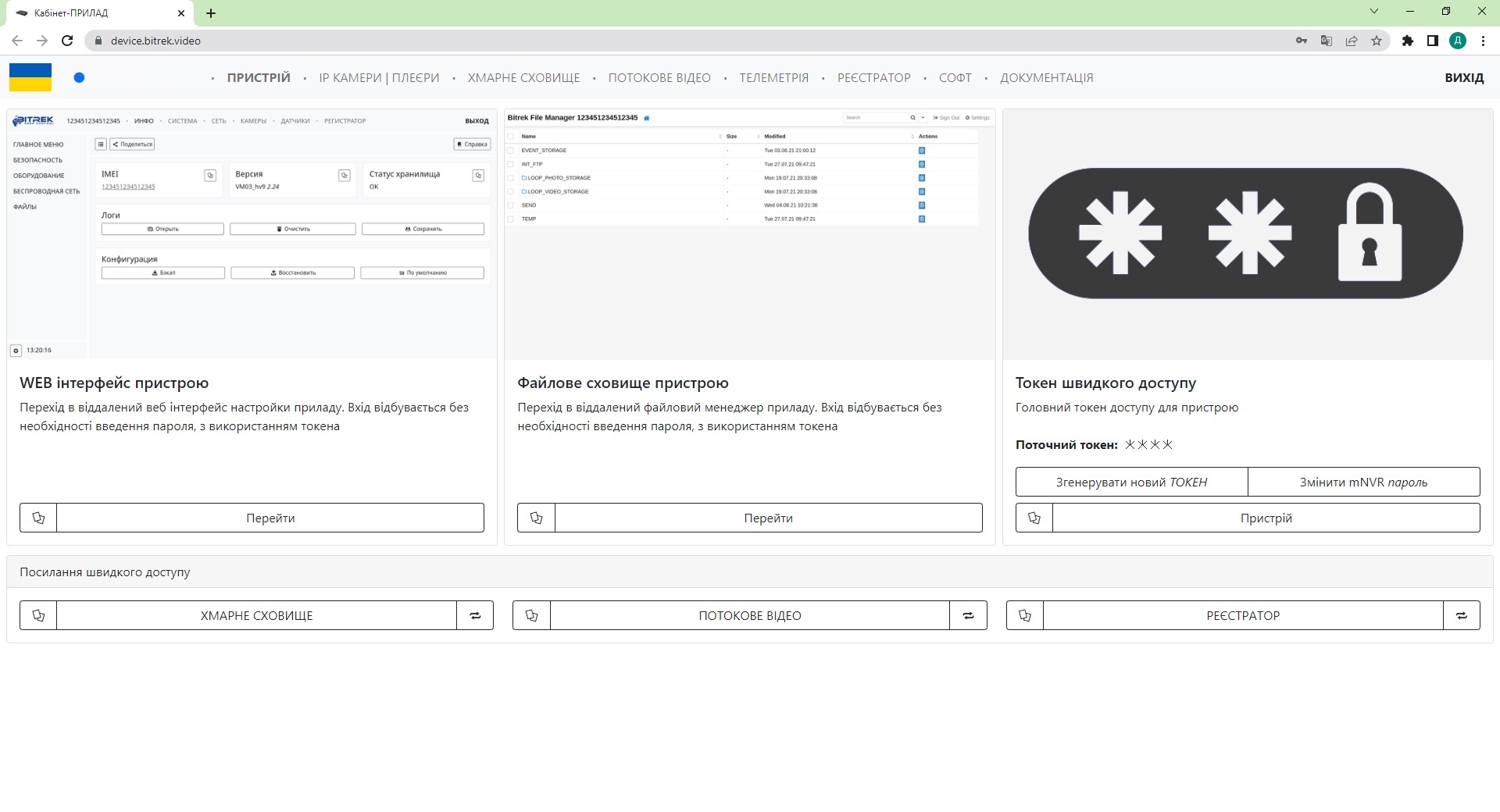 В головному меню в розділі Токен швидкого доступу натискаємо на кнопку Потокове відео, і переходимо у відповідний розділ, де будуть відображені всі камери підключені до пристрою та їхня трансляція у прямому ефірі