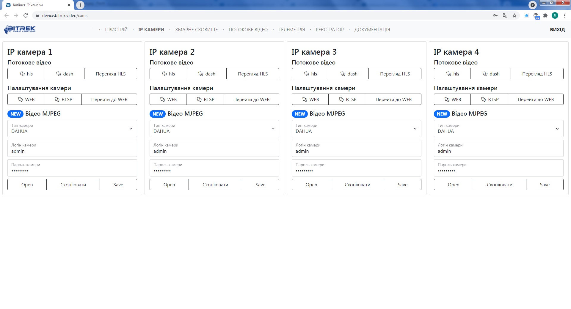 В розділі токен швидкого доступу натискаємо кнопку IP камери та на потрібній нам камері копіюємо dash посилання натиснувши на нього: