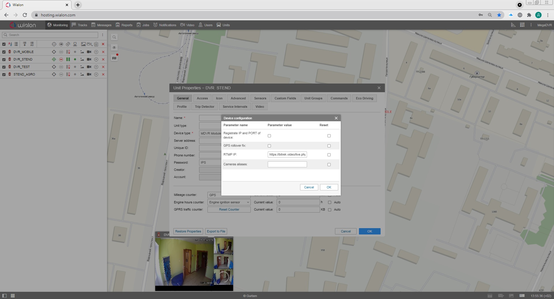 Звідси вам буде доступне основне меню сервісу Wialon, зліва буде список доступних пристроїв, для отримання пряммої трансляції з них, вам потрібно біля потрібного пристрою натиснути кнопку відкидного списку(open additional options) та натиснути іконку ключа(open properties diaolog).