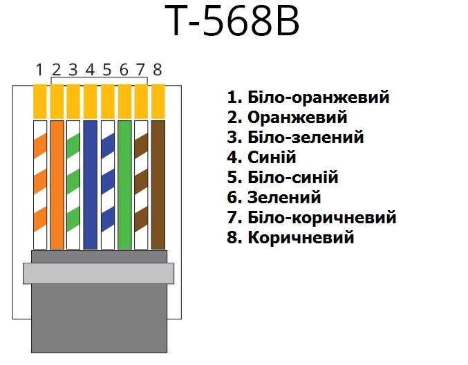Існує два способи розпіновки роз'єму RJ45: T-568A та T-568B, тип розпіновки на швидкість передачі даних не впливає, тому вибирайте той, який вам більше вам до вподоби. Ми використовуємо T-568B.