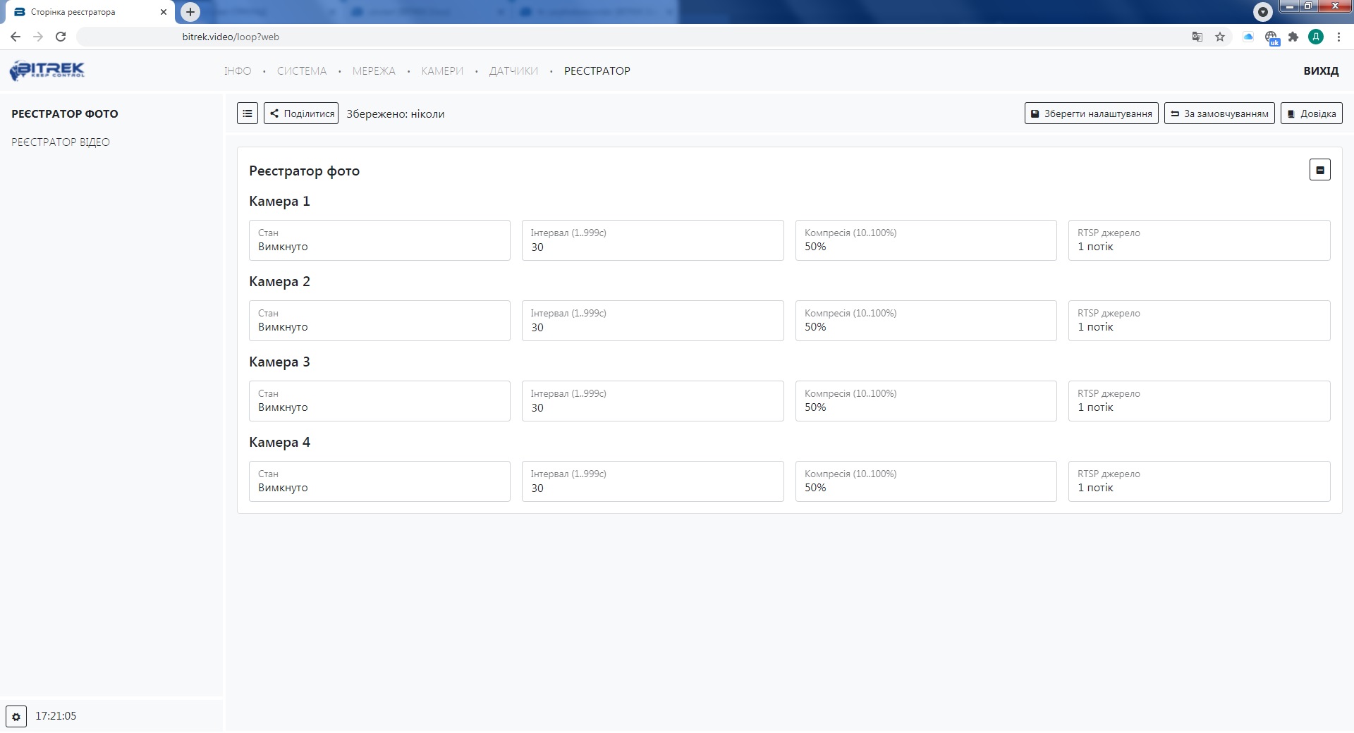 Для початку вам потрібно зайти в меню конфігурації приладу, та перейти на вкладку Реєстратор/Реєстратор фото