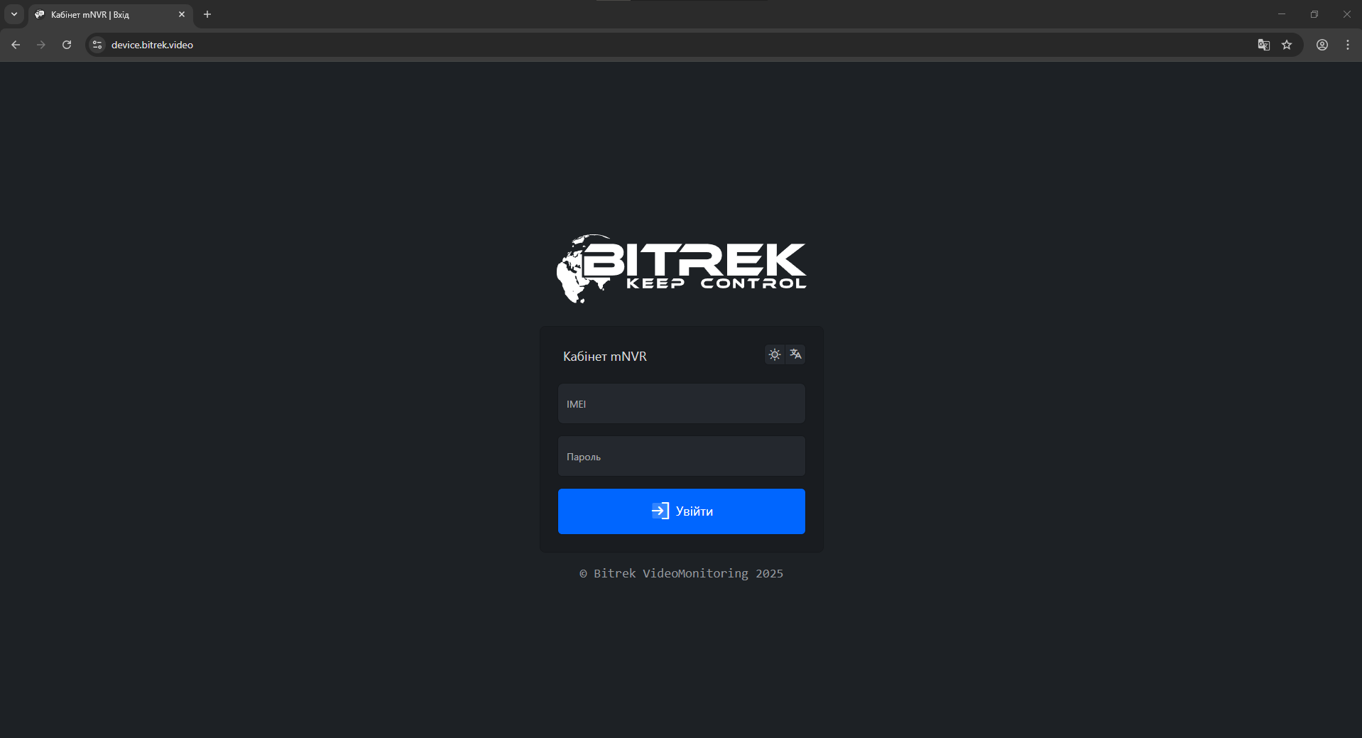 Заходимо на сайт https://device.bitrek.video/ вводимо IMEI та пароль який надрукований на наліпці в паспорті пристрою: