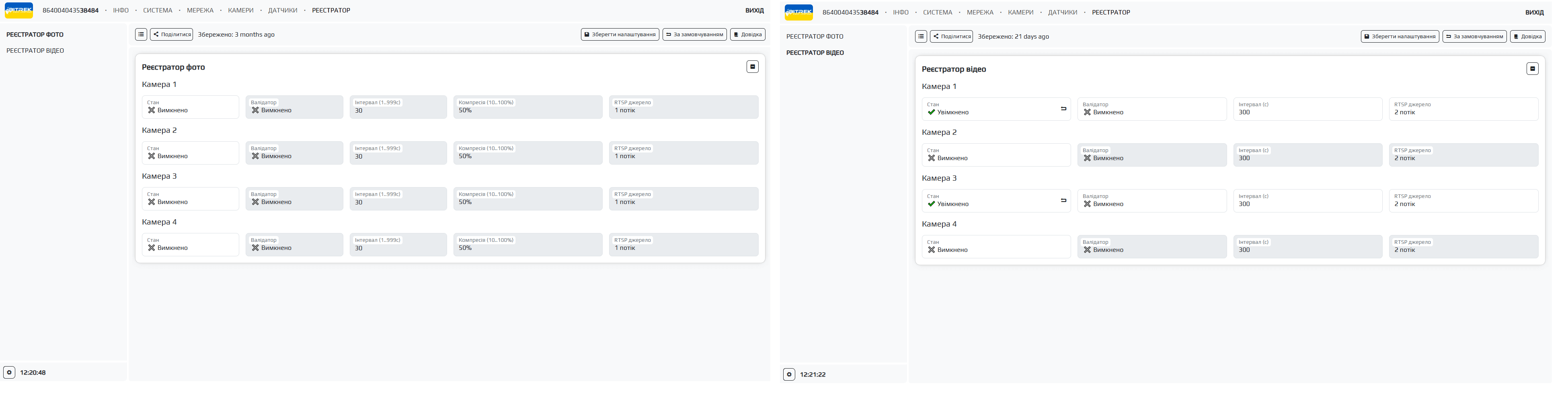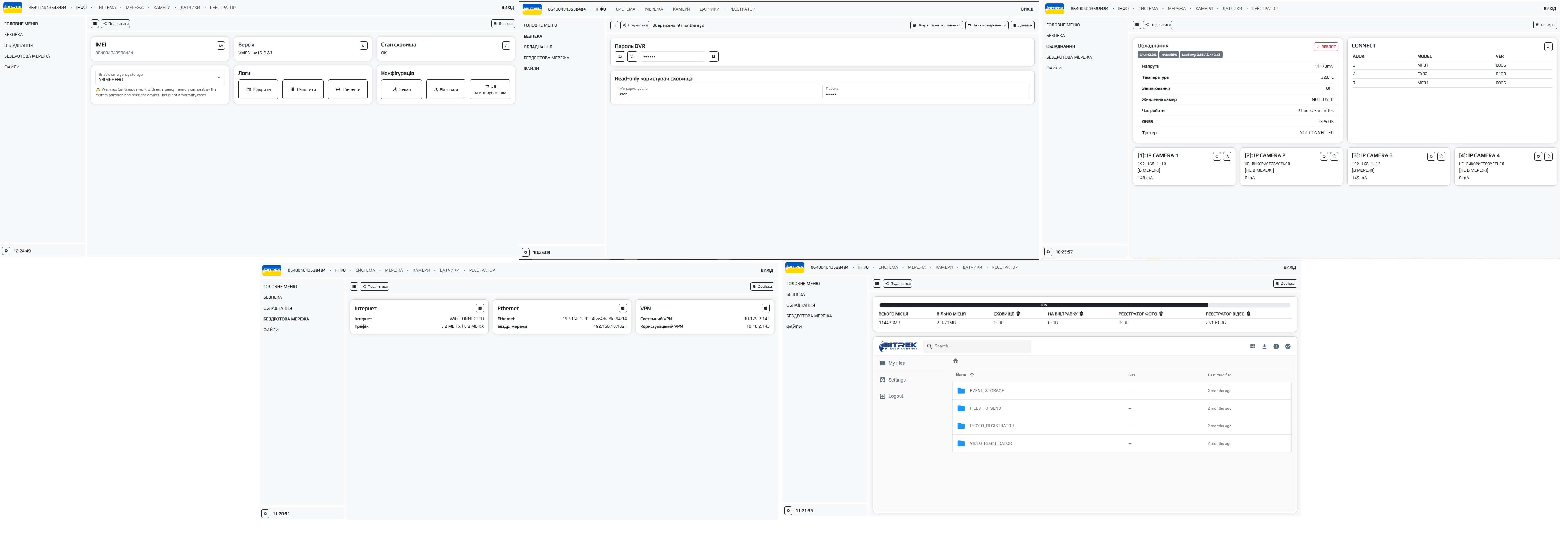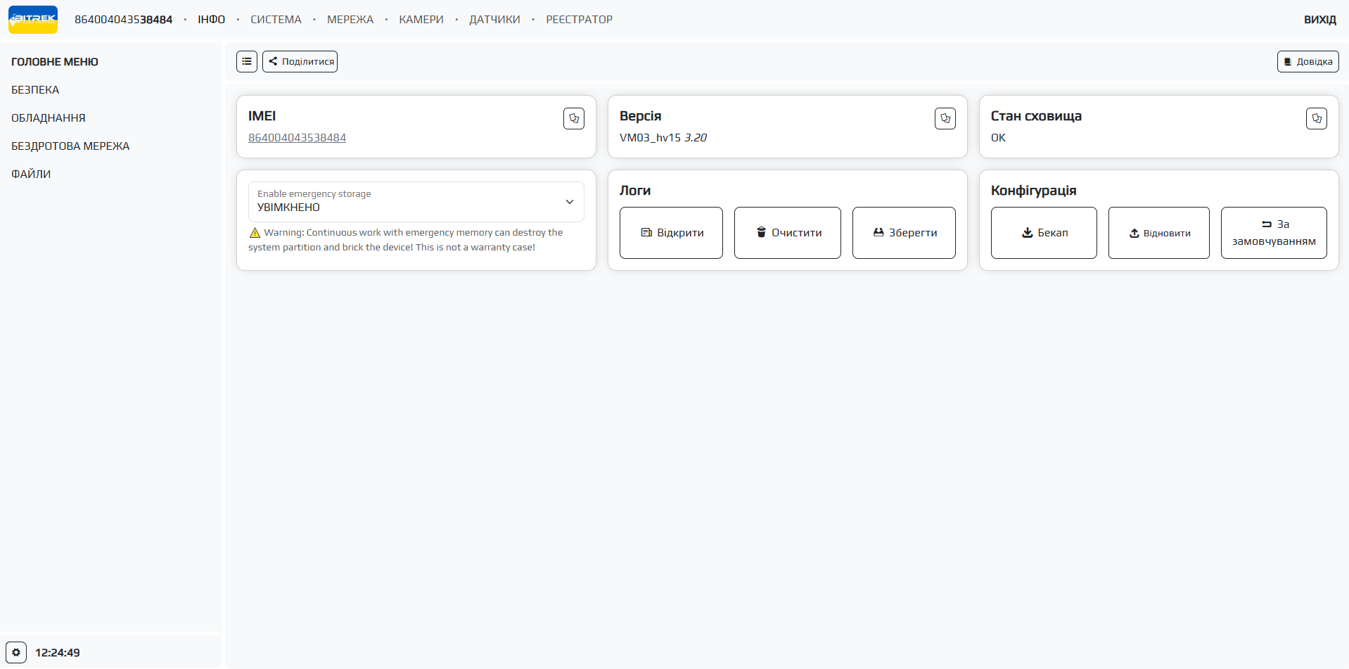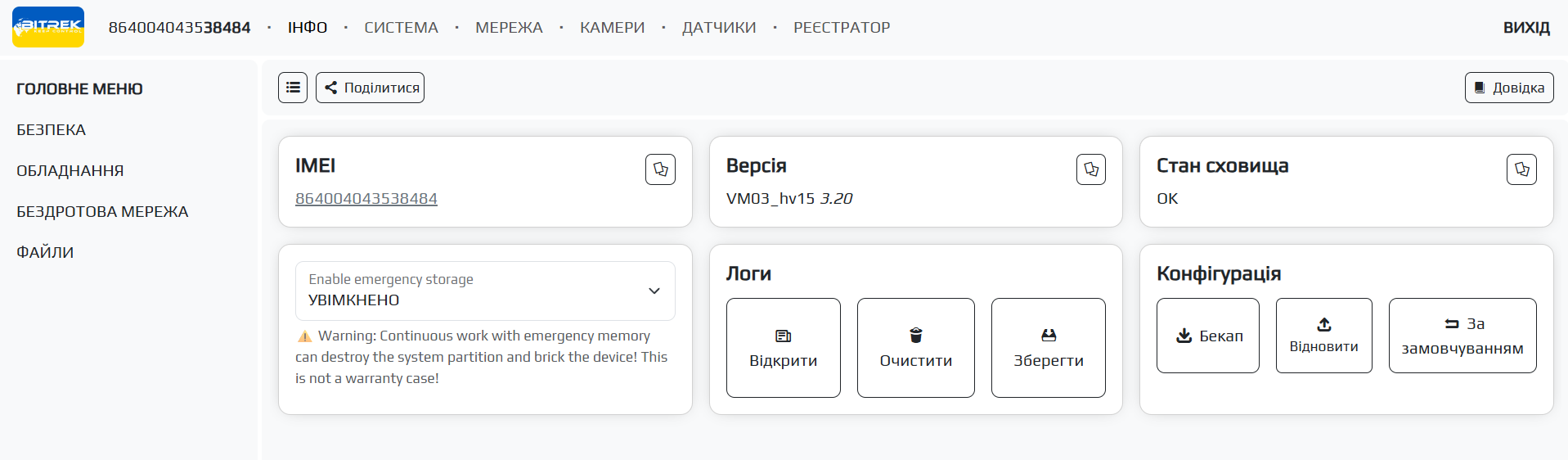 Тут ми можемо бачити основні вкладки такі як: ІНФО, СИСТЕМА, МЕРЕЖА, КАМЕРИ, ДАТЧИКИ, РЕЄСТРАТОР та допоміжні вкладки по кожному із розділів які розташовуються зліва. Пройдемося коротко по кожній із вкладок