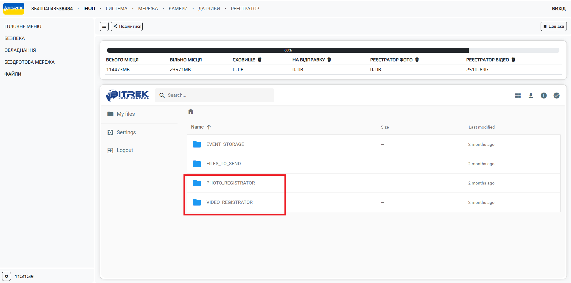 Примітка: Мультимедія буде надсилатися в папку …_REGISTRATOR в розділі ІНФО/ФАЙЛИ