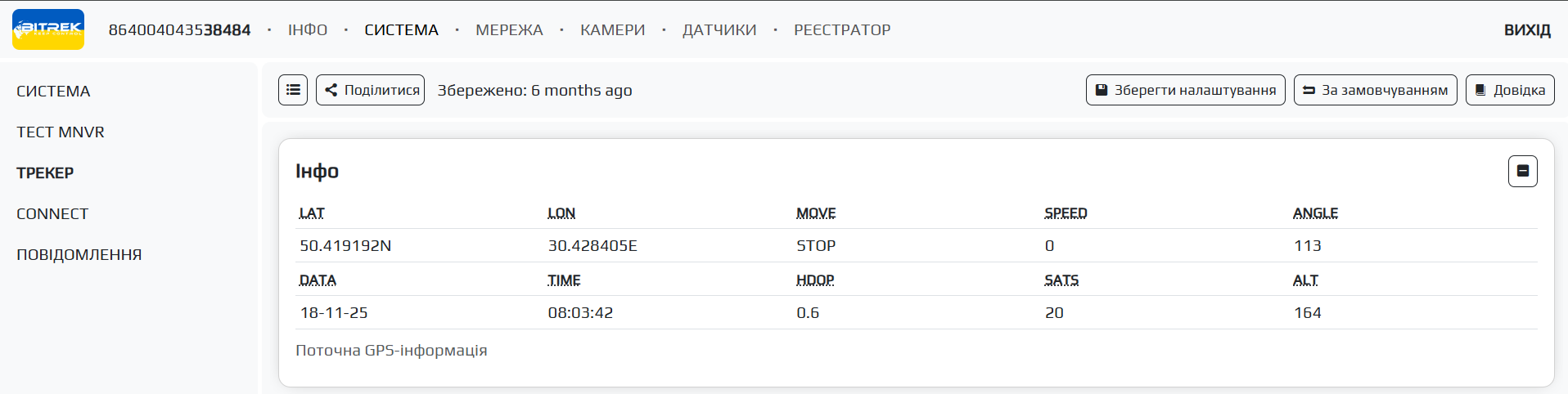 Після вдалого налаштування модулю у вкладці Інфо ви зможете побачити поточну GPS інформацію про ваше місце знаходження