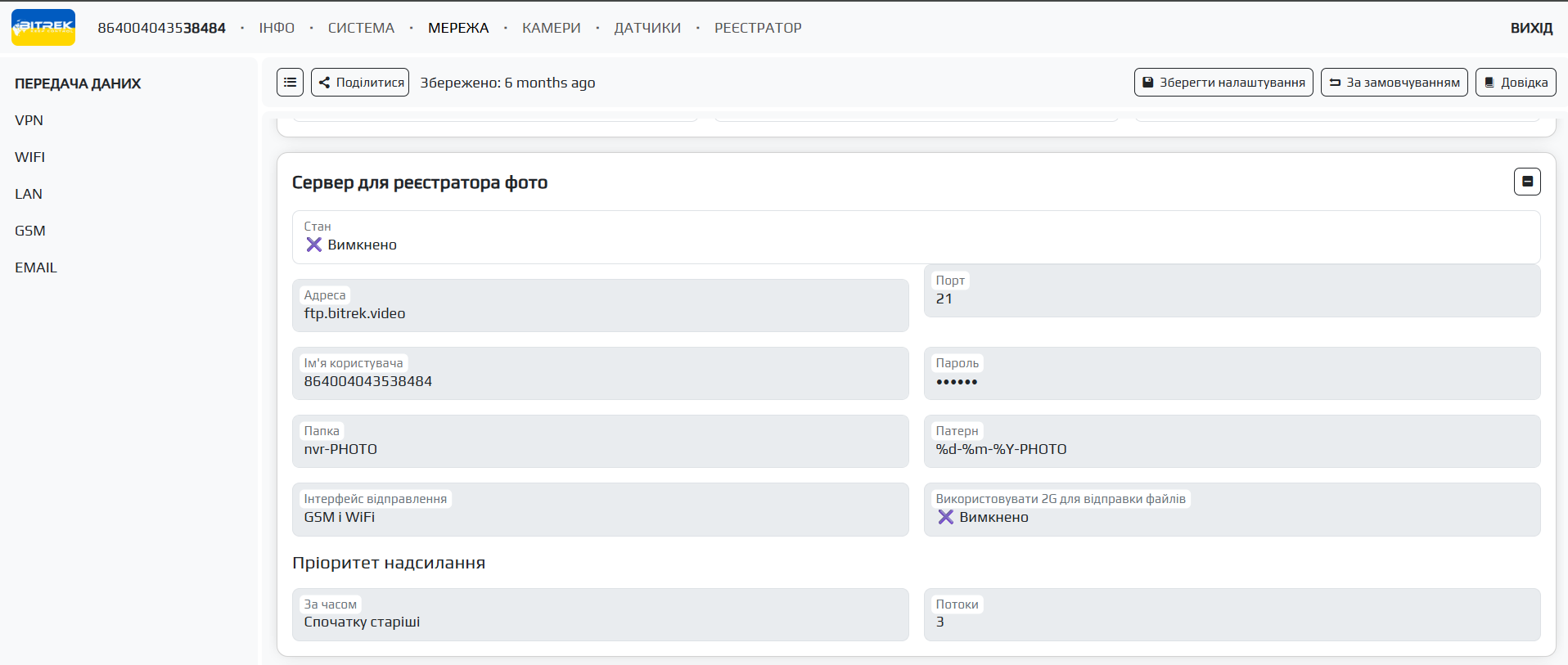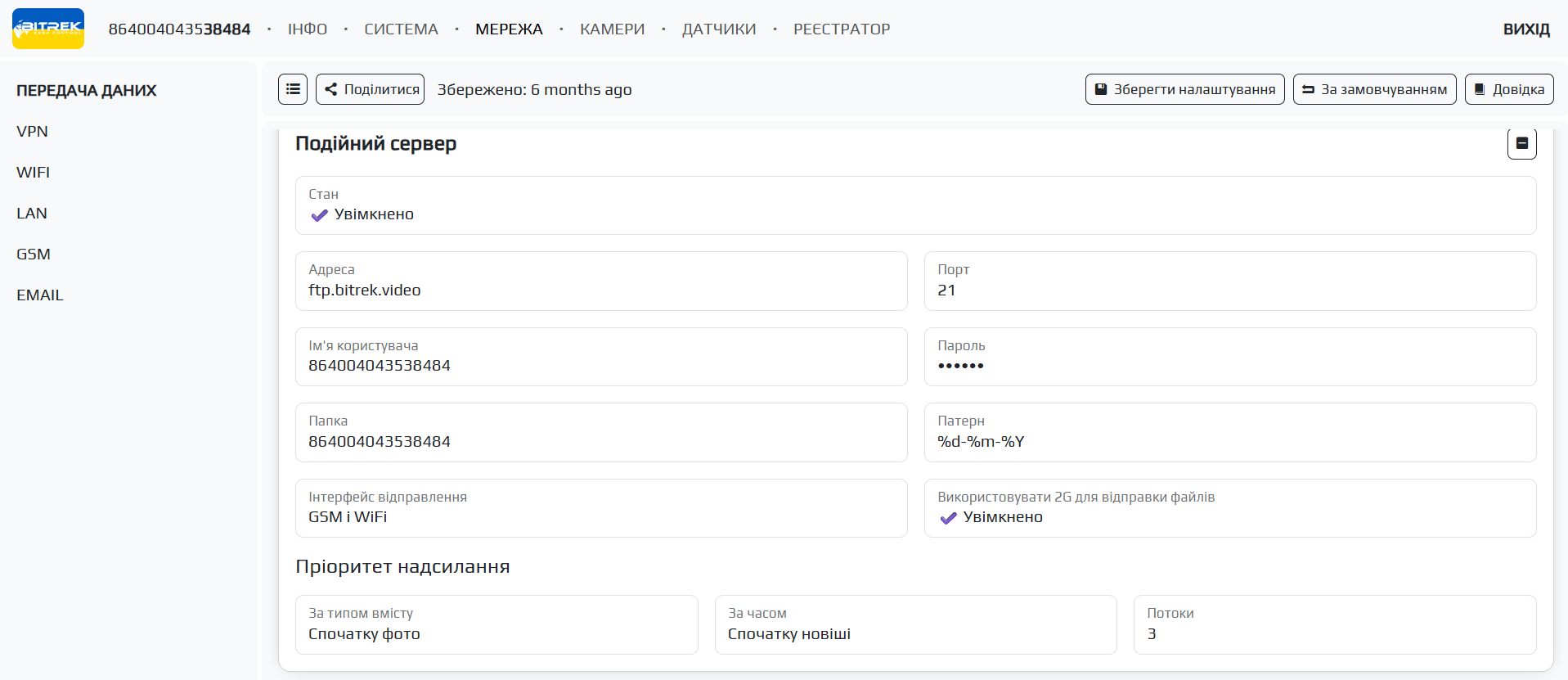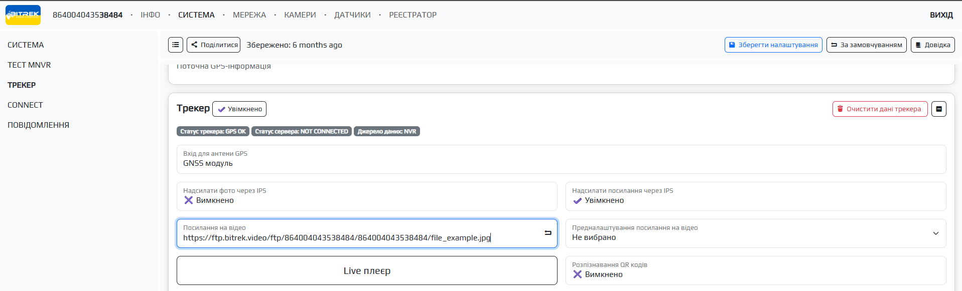 Передналаштування посилання на відео - якщо ви оплатили доступ до FTP ви можете вибрати сервер на який можна буде перейти вказавши посилання на відео у відповідному полі(вказати потрібно адресу сервера, ID пристрю, паку файлу та його назву, наприклад: https://ftp.bitrek.video/ftp/IMEI/IMEI/file_example.jpg )