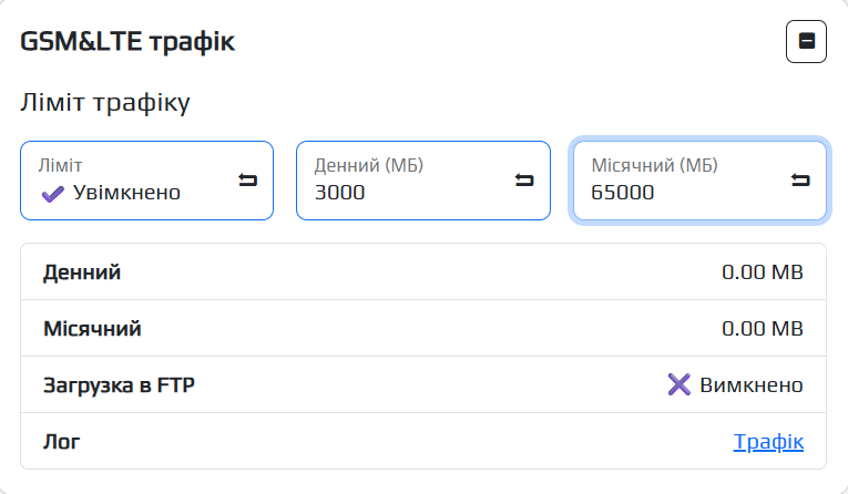 Ви можете налаштувати ліміт трафіку на пристрої для його заощадження, для цього потрібно перйти на вкладку МЕРЕЖА/GSM увімкнути ліміт за допомогою відповідної кнопки та задати обмеження для використання трафіку пристроєм на день чи на місяць.