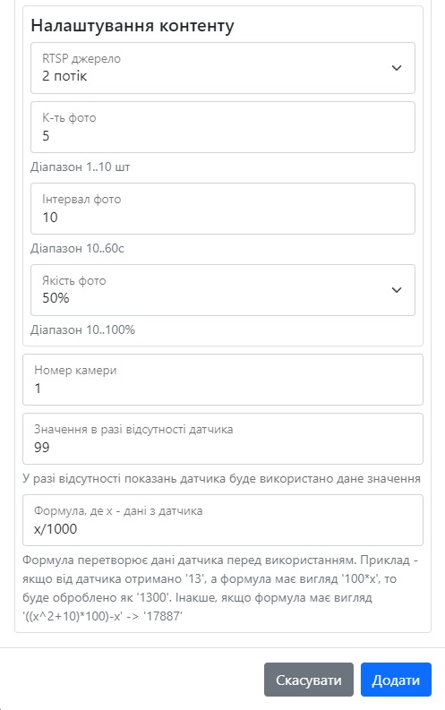- RTSP джерело(1 потік - вища якість, 2 потік - гірша якість).