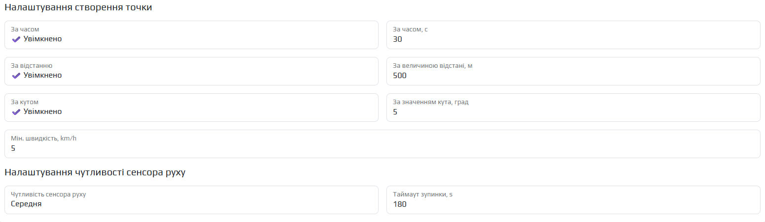 Ви модете налаштувати створення точок для треку руху вашого транспорту за допомогою таких параметрів як:
